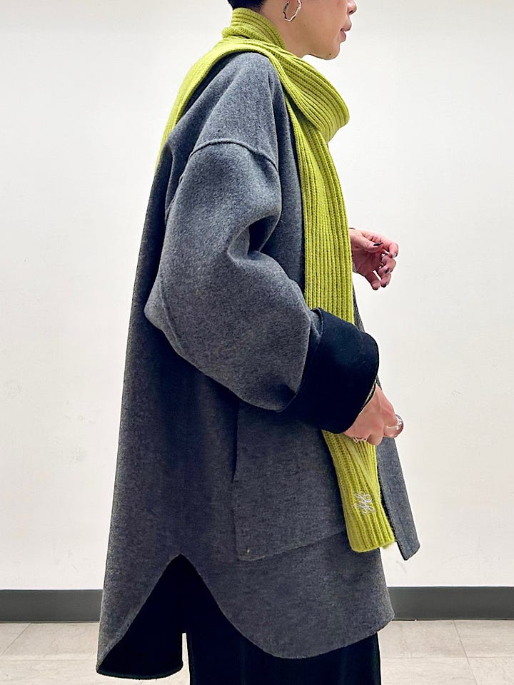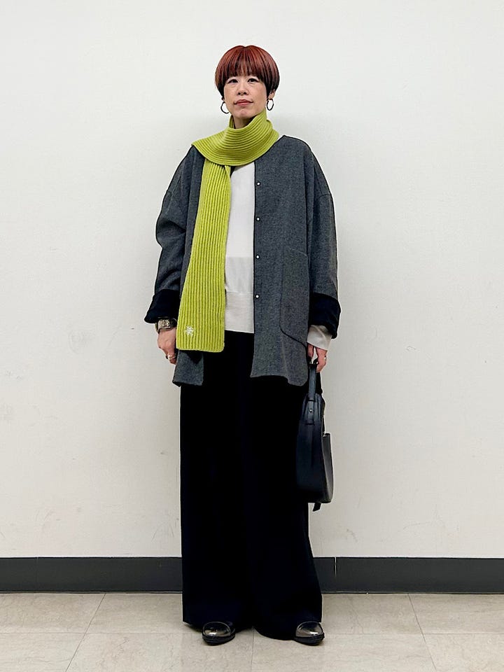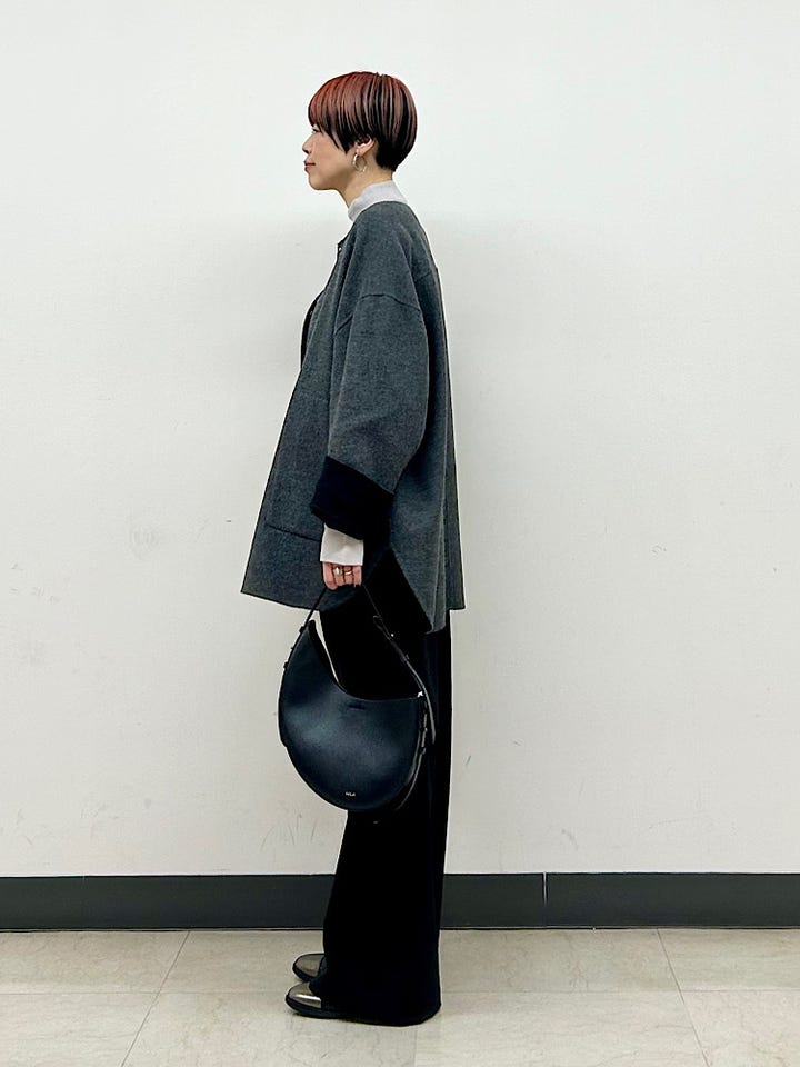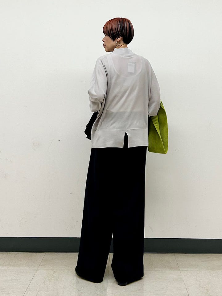 着心地:カーディガン感覚で着られるほど軽いです。柔らかく、優しい肌触り。ゆとりもあり、肩周りが開放感があってノンストレス。インナーも選ばず着られます。