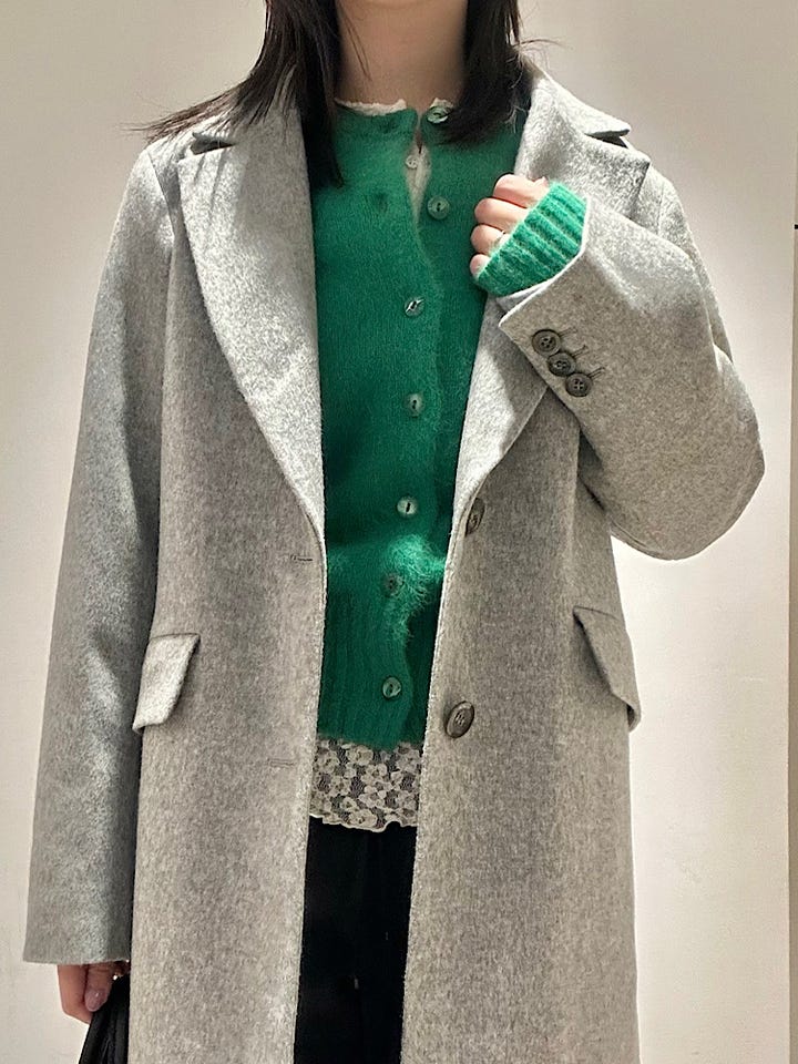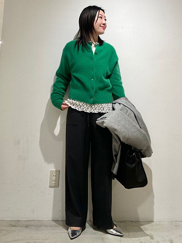 きちんと感があるコーデの差し色にぴったりなグリーンのニットは暖かさと柔らかさが魅力的。