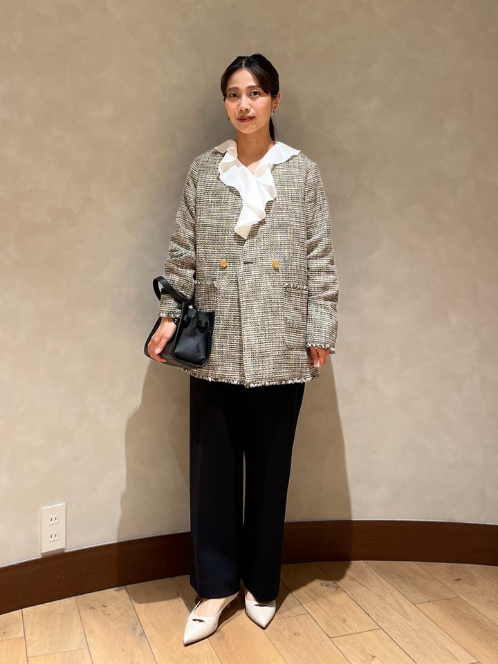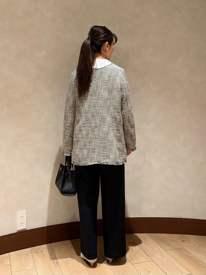 着心地:ややゆったりとしたシルエットでかたくなりすぎず、オケージョン以外でも着回しやすいです。ツイード素材ですが軽いです。