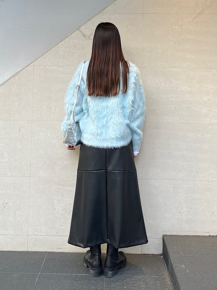 毛足の長い質感がコーディネート全体のポイントになります。とても軽くて温かく、着心地も良いです。