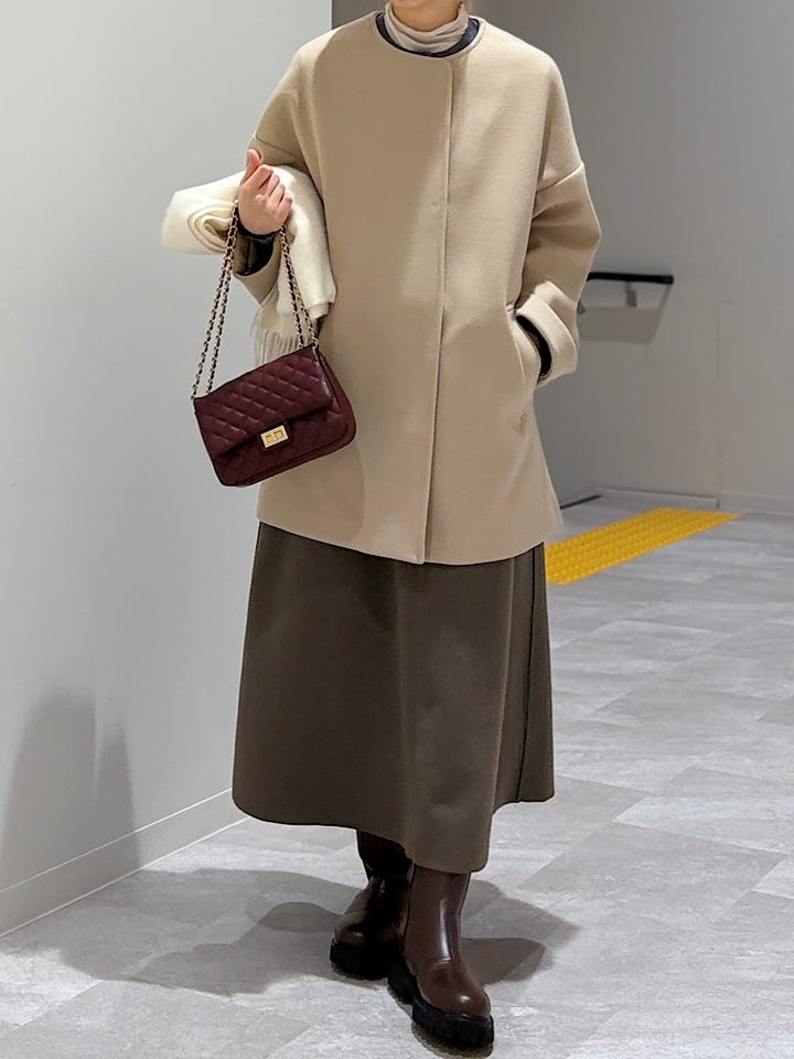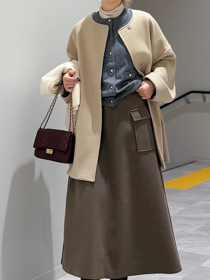 【素材感・着心地】冬らしい温かみのあるメルトン生地です!フレアなシルエットでブーツとの相性◎