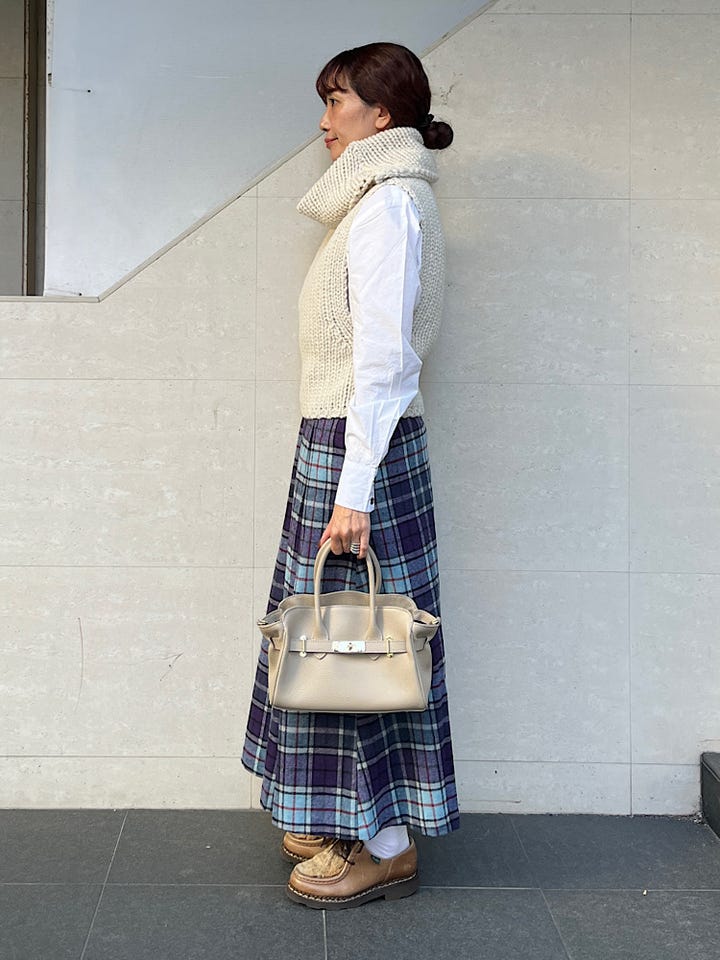 着心地:配色が可愛いチェックスカートです。起毛感があり暖かみのある生地です。