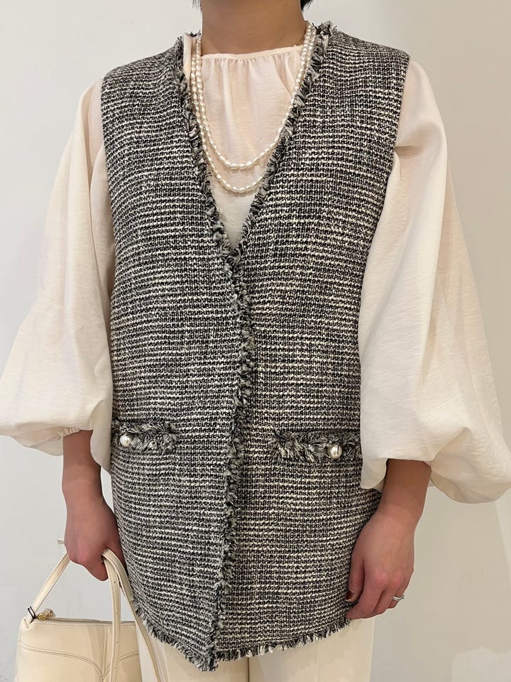着心地:軽くて楽です。アームホールが広いのでボリューム感のあるブラウスともレイヤードできます。襟や裾、ポケット口のフリンジと、パールモチーフのボタンが華やかな印象です。