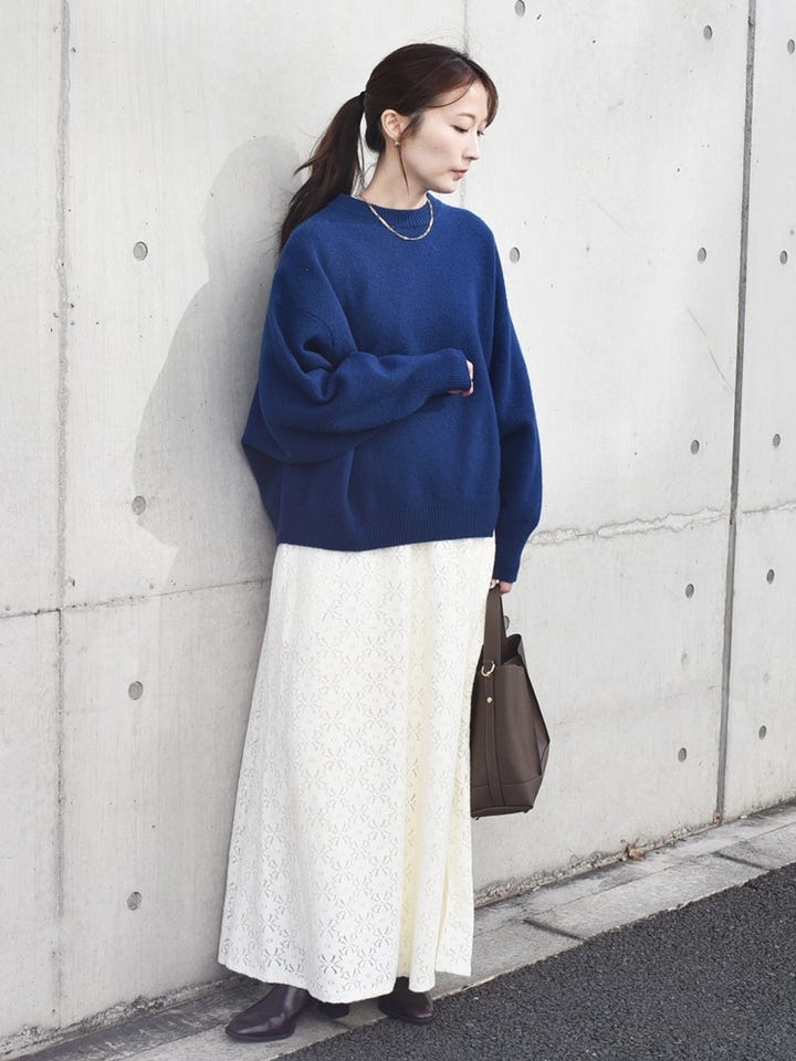 ニットに、起毛感のあるスカートを合わせたふんわりとした素材感がポイントのコーデ。