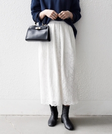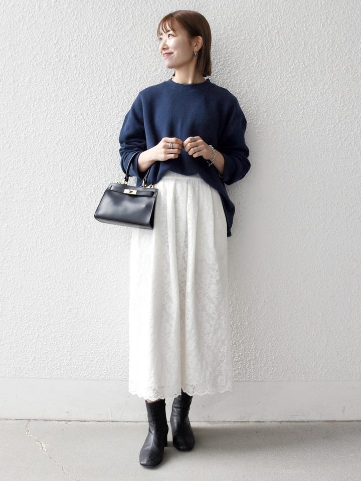 レーススカートでも甘くなりすぎないシルエットのニットです。