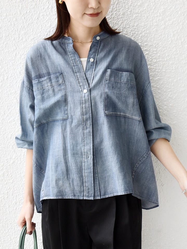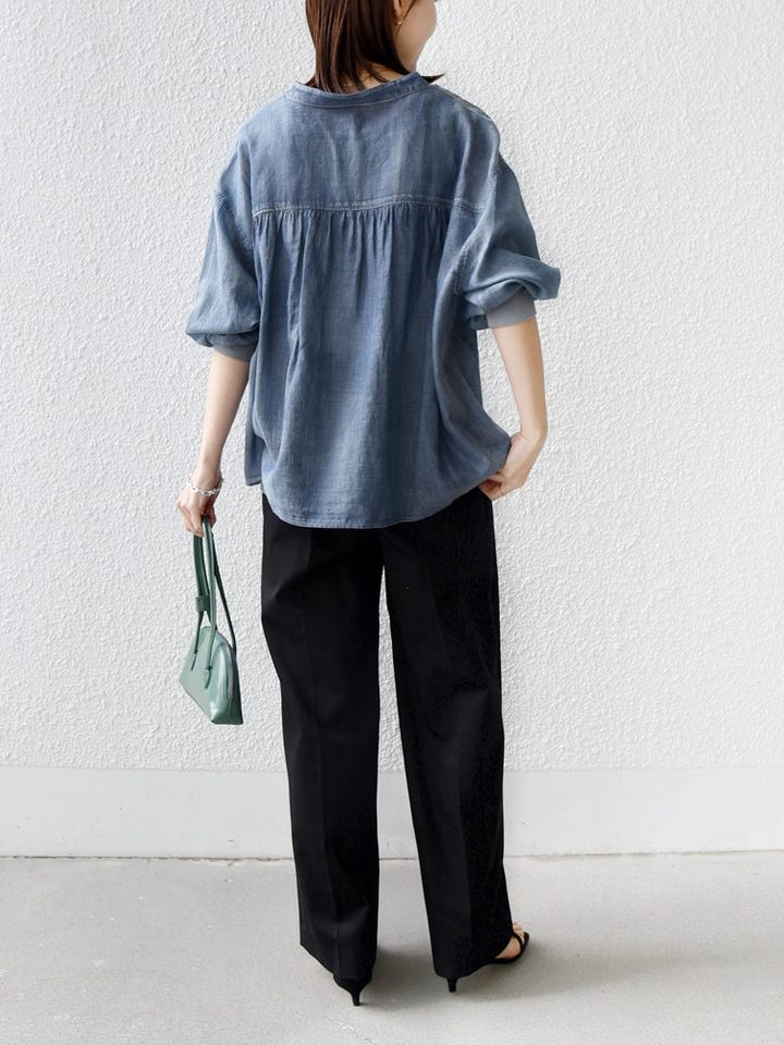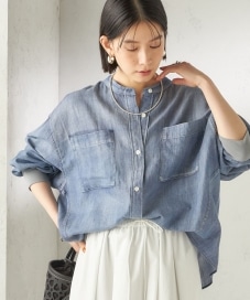 〔ONE SIZE〕《予約》〈手洗い可能〉シアー デニム 袖 リブ バンドカラー シャツ