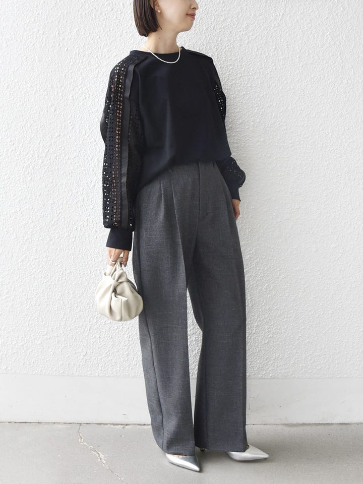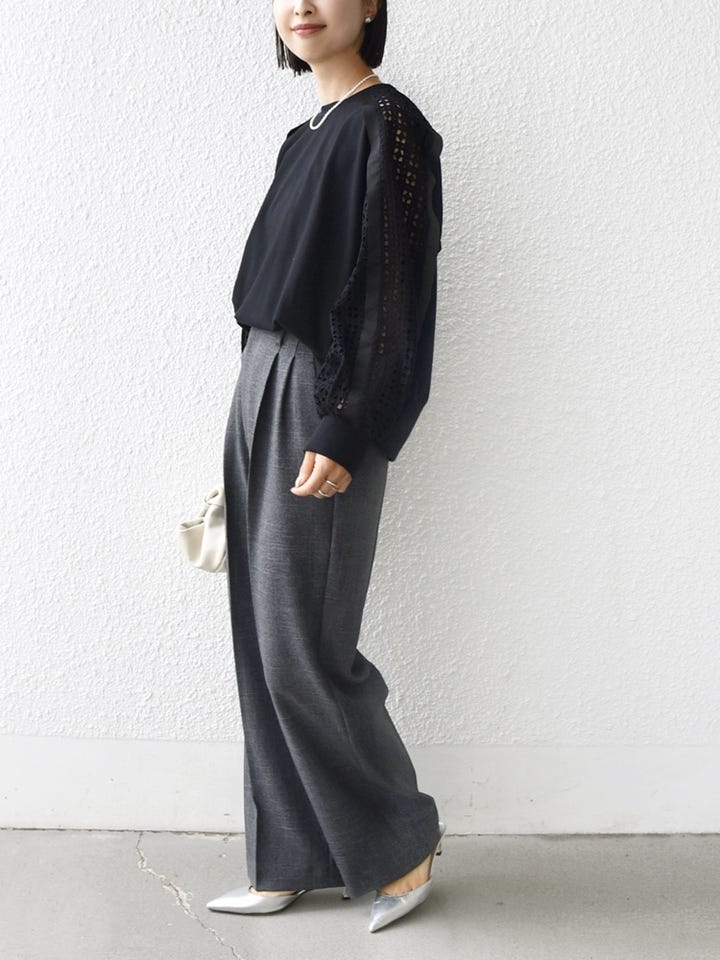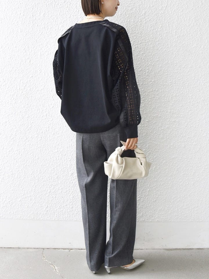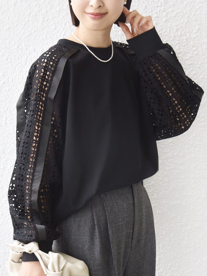 素材感:カットソー部分は、薄すぎず程よく厚みがある生地感です。袖部分は繊細なレースになっていて透け感があります。