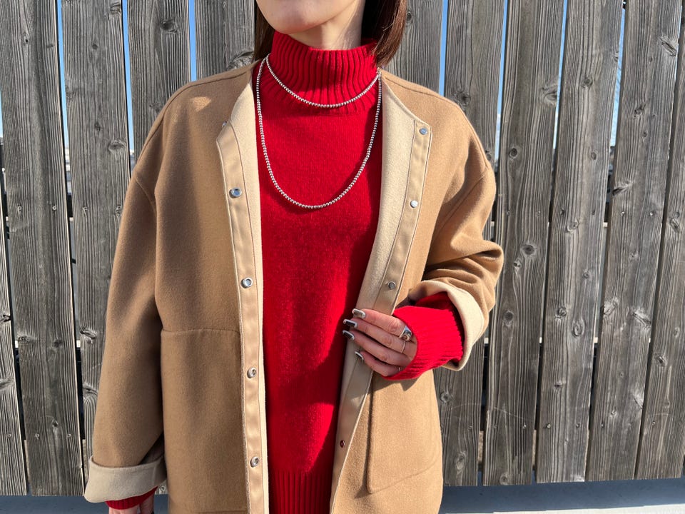 ノーカラーなので、ハイネックニットとも相性良いです!