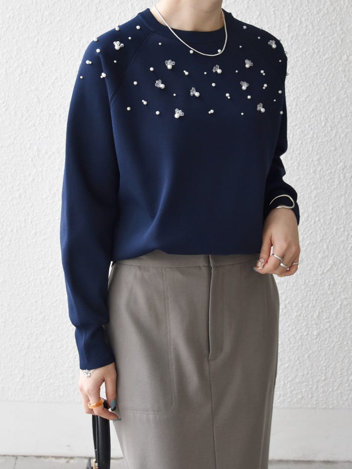 着用アイテム:SHIPS any:〈手洗い可能〉パールモチーフ ビジュー クルーネック ニット