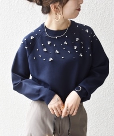 〔ONE SIZE〕SHIPS any:〈手洗い可能〉パールモチーフ ビジュー クルーネック ニット