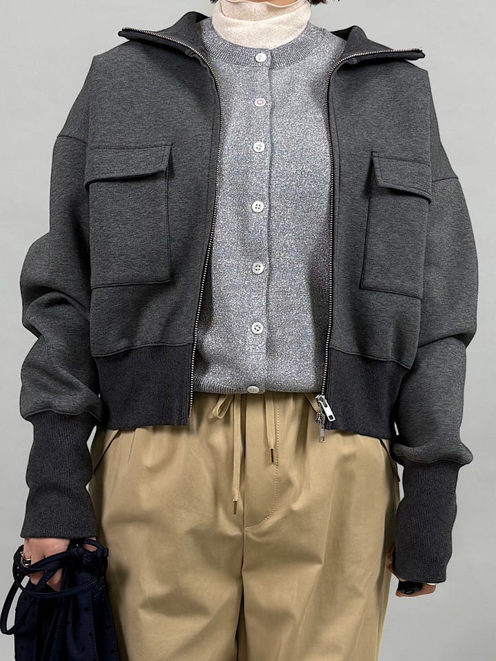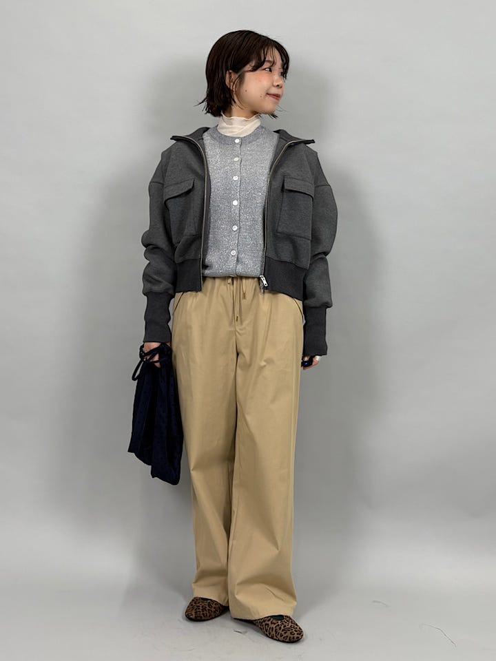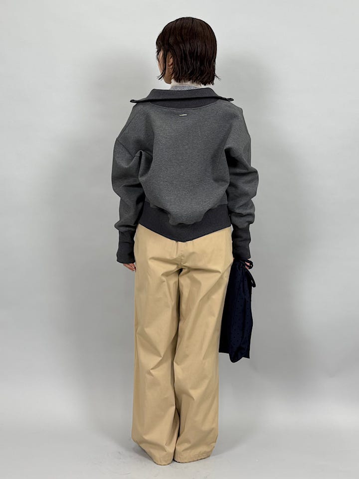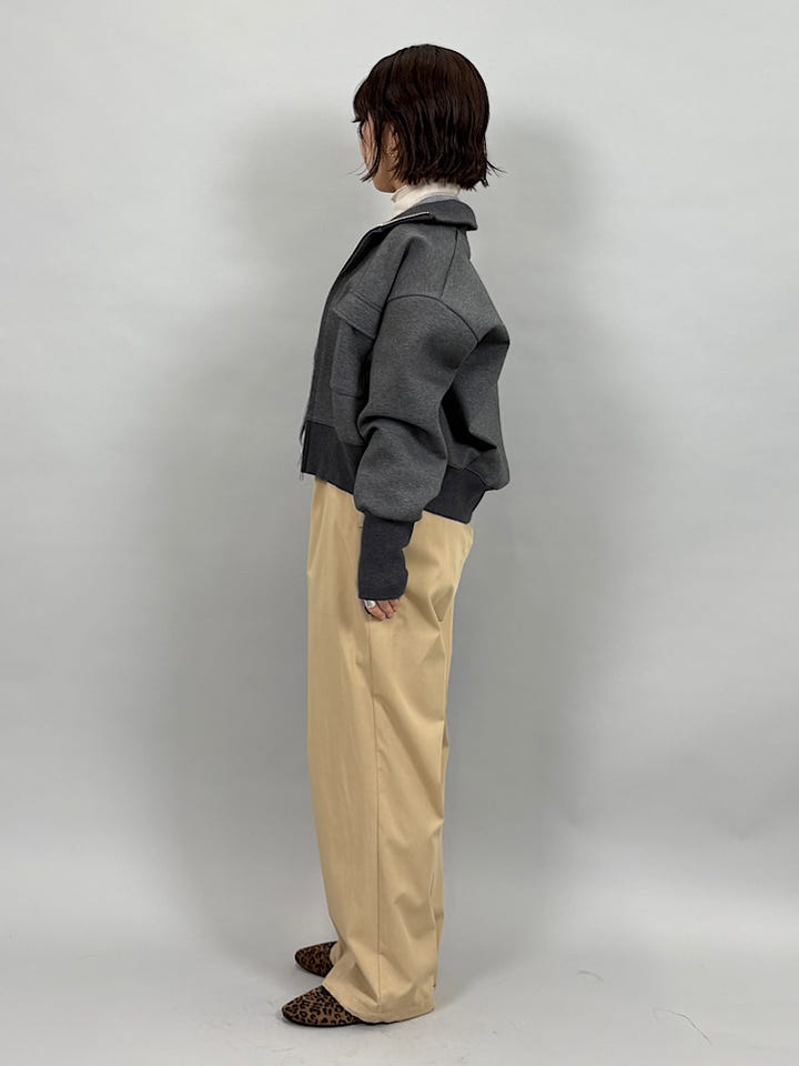 もちっとしたコットンダンボール素材。なめらかで伸縮性があり、とても着心地が楽です◎首元と袖周りのリブがポイントで、ジップを上まで閉めてもかわいいです。