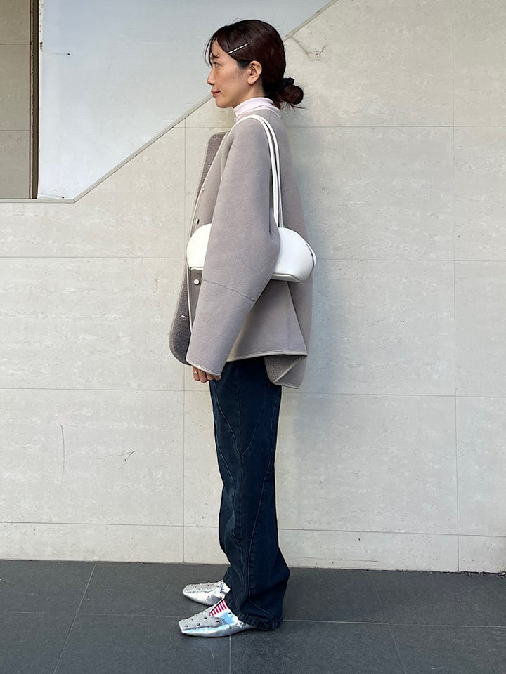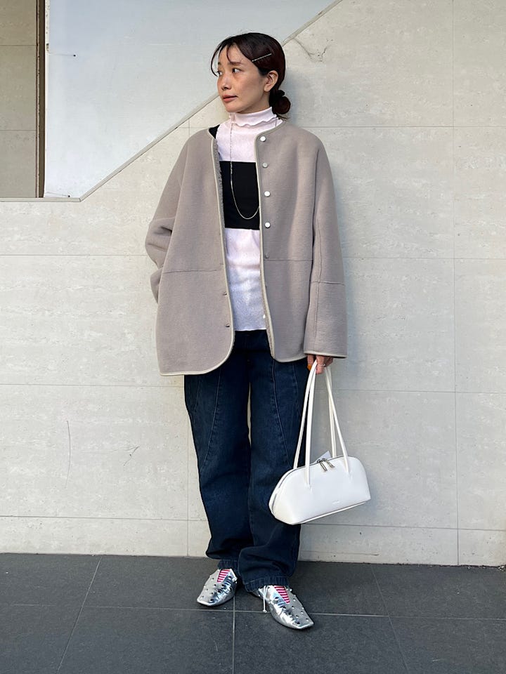 サイズ感:コンパクトめ。伸縮性があるので中に薄手のタートルネックインナーをレイヤードしても着用できました。