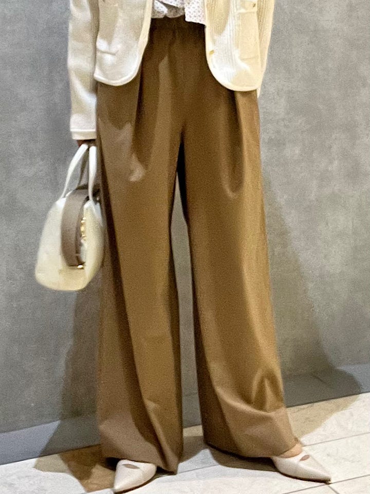 着用感 : さほど厚みがなく感じますが生地もしっかりしています。ウエストはゴム仕様ですが綺麗めのブラウスにもコーディネイト出来て万能です。