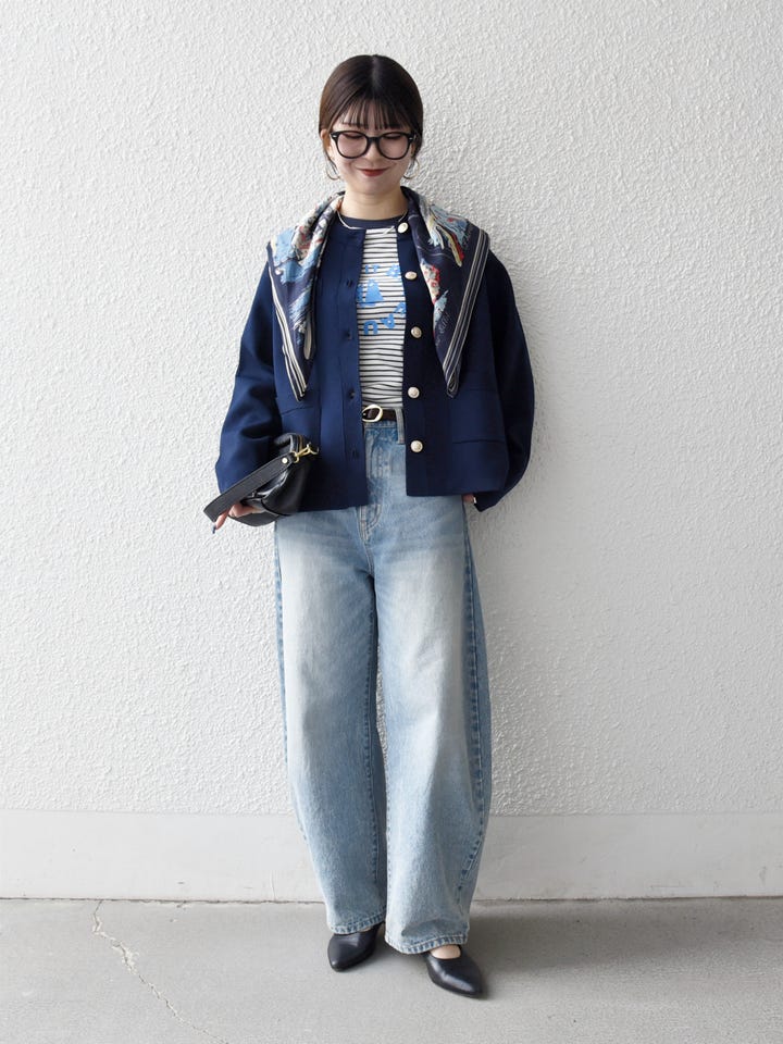 ボーダー×デニムのカジュアルスタイルに、きれいめカーデで大人っぽさをプラス。