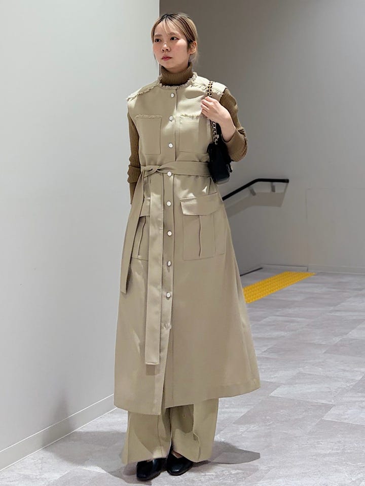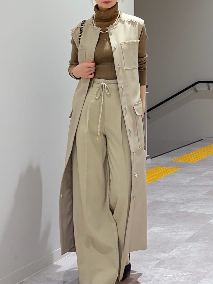 【素材感・着心地】カジュアルにもきれいめもどちらも着て頂けます!!フリンジがアクセントになっておしゃれな印象♪ボタンを閉めてワンピースとして、ボタンを開けてジレとしても、アレンジを沢山楽しんで頂けます!