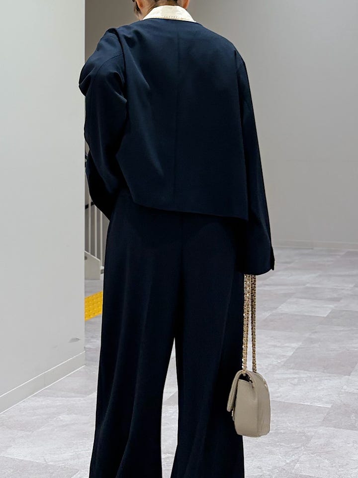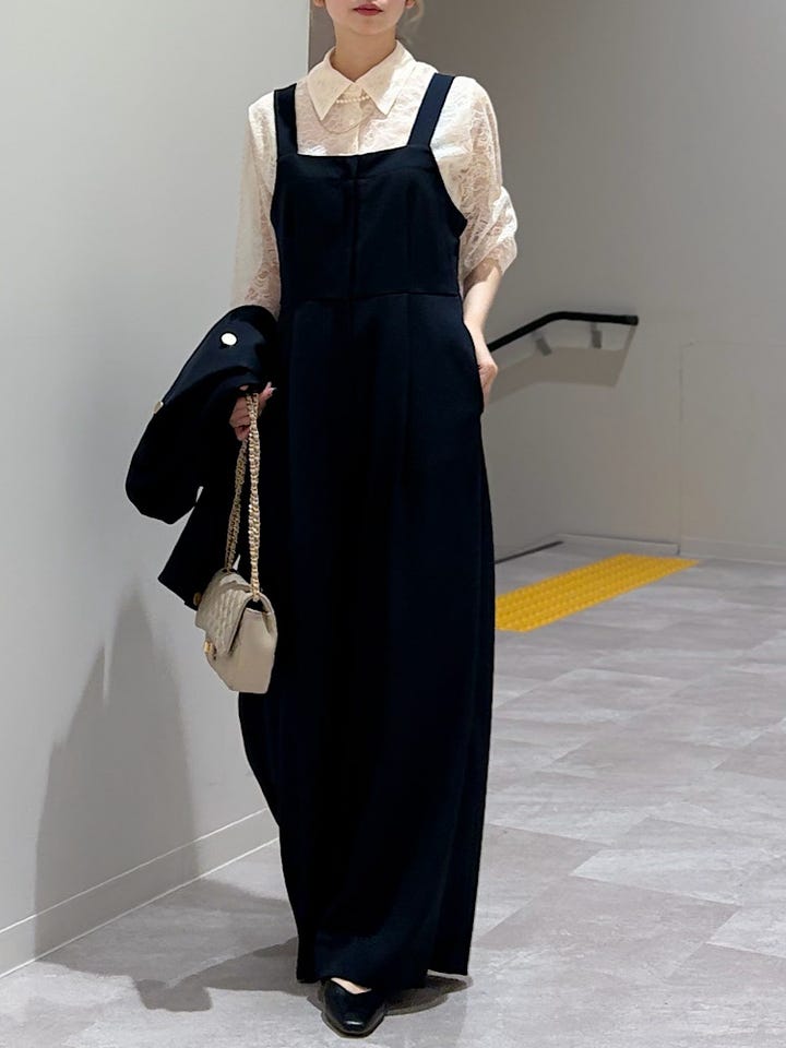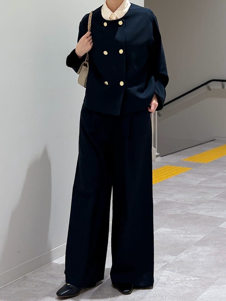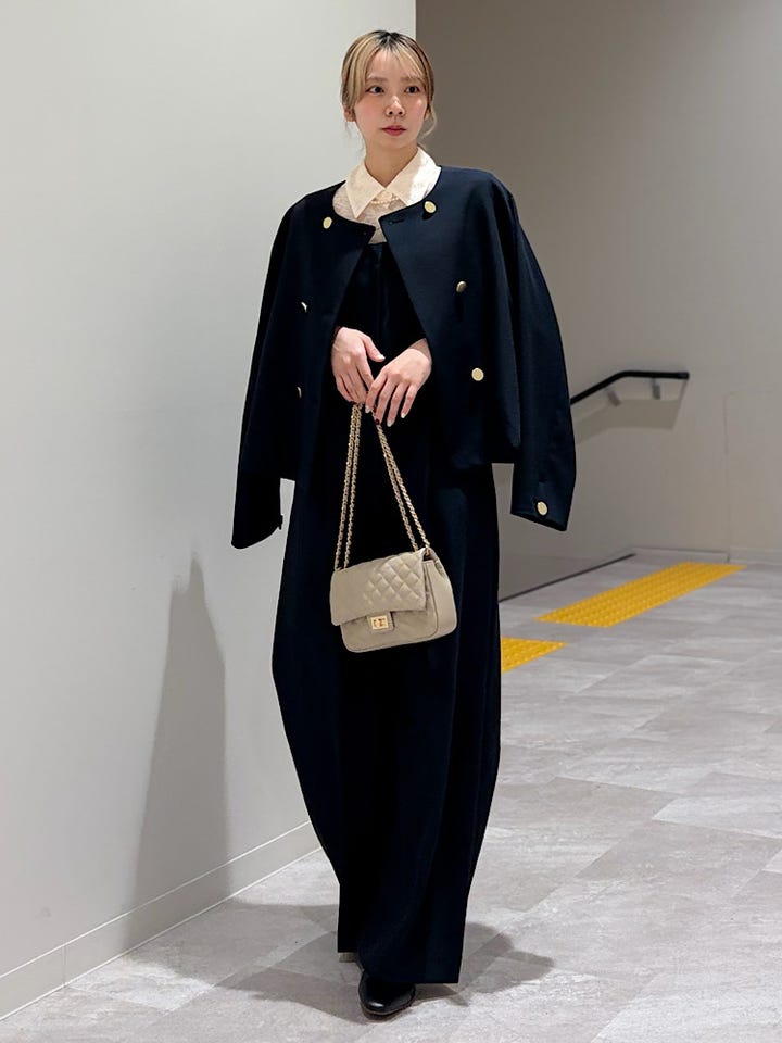 【素材感・着心地】裏地あり。肩紐は後ろのボタンで2段階調節できます。ポケットあり。ジャケットとセットアップ対応でこちらも普段着とセレモニー、お仕事着色々な場面で活躍しそうです!!バレエシューズでも、すらずに着用できましたよ!