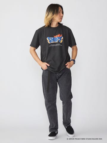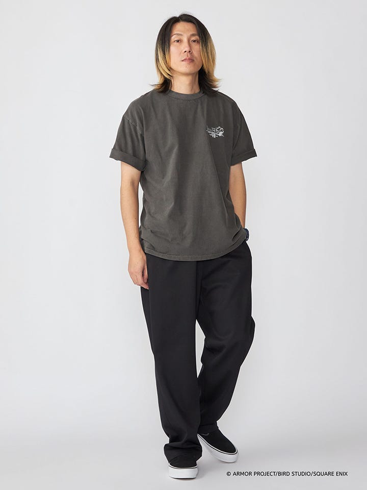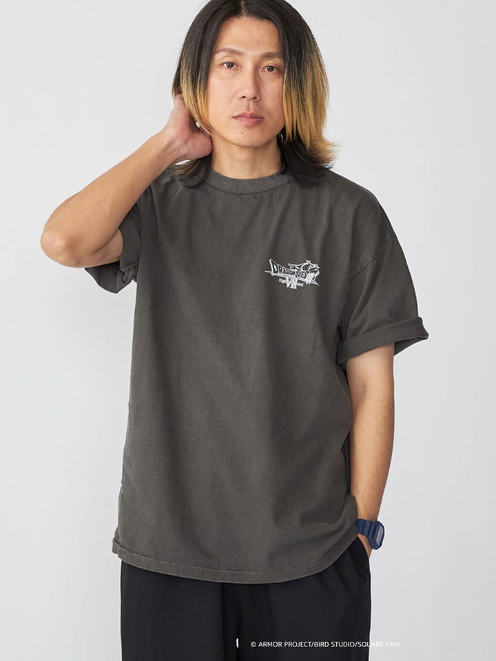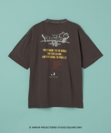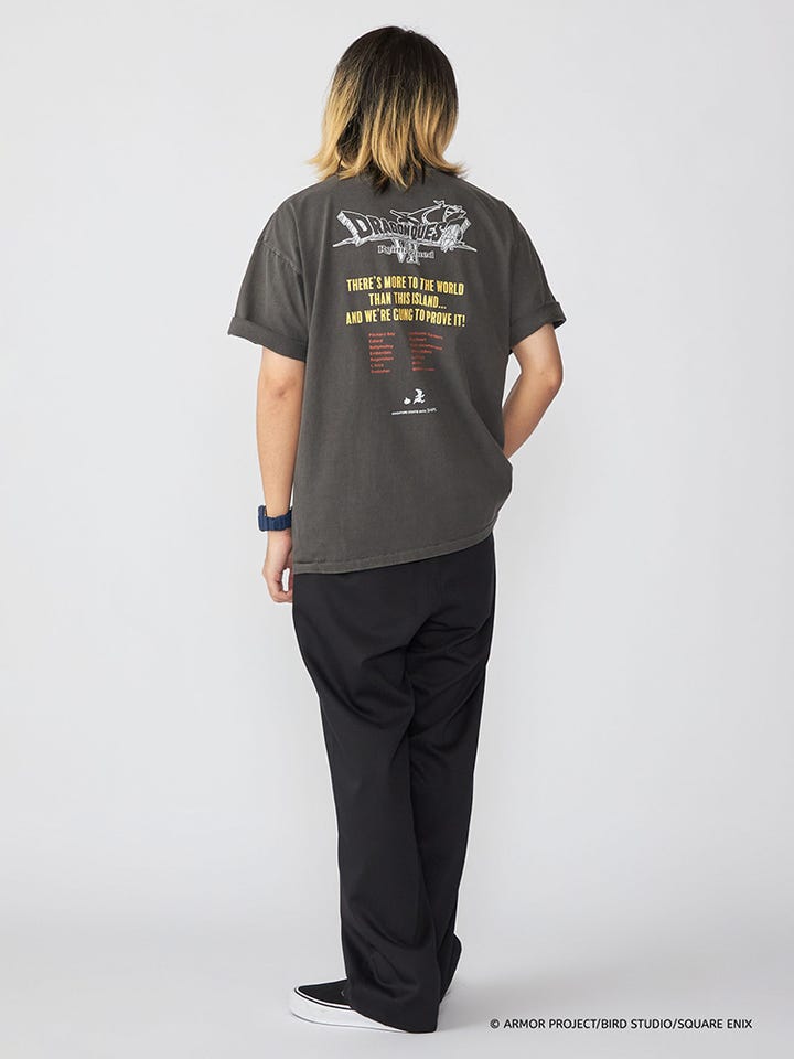 『ドラゴンクエストVII Reimagined』のテーマ“冒険の旅”を、ロックバンドのツアーTシャツ風にアレンジしたバックプリントが印象的な一枚。「海のむこうには もっと広い世界がある ……オレたちが 証明するんだ!」のステートメントに加え、「フィッシュベルの村」「グランエスタード城下町」「ウッドパルナの村」など、DQ7Rの舞台となる地名の英語名が刻まれています。また、ボディにユーズド加工を施し、着こなしにこなれ感を添える、コラボならではのデザインに仕上がっています。