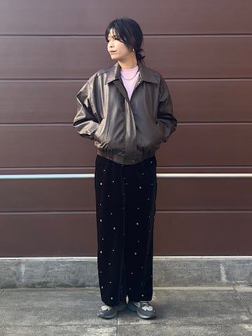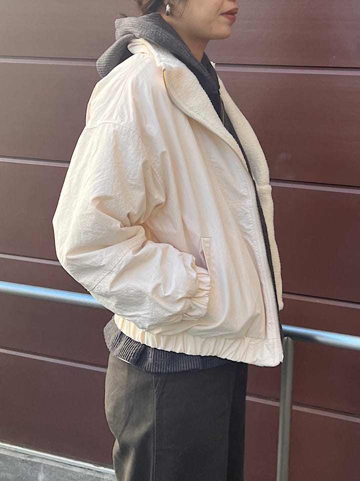 素材感・着心地:ナイロン×ボアで暖かいです。ボリューム感はありますが着丈が短く、メリハリがあるデザインです。