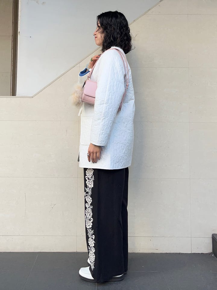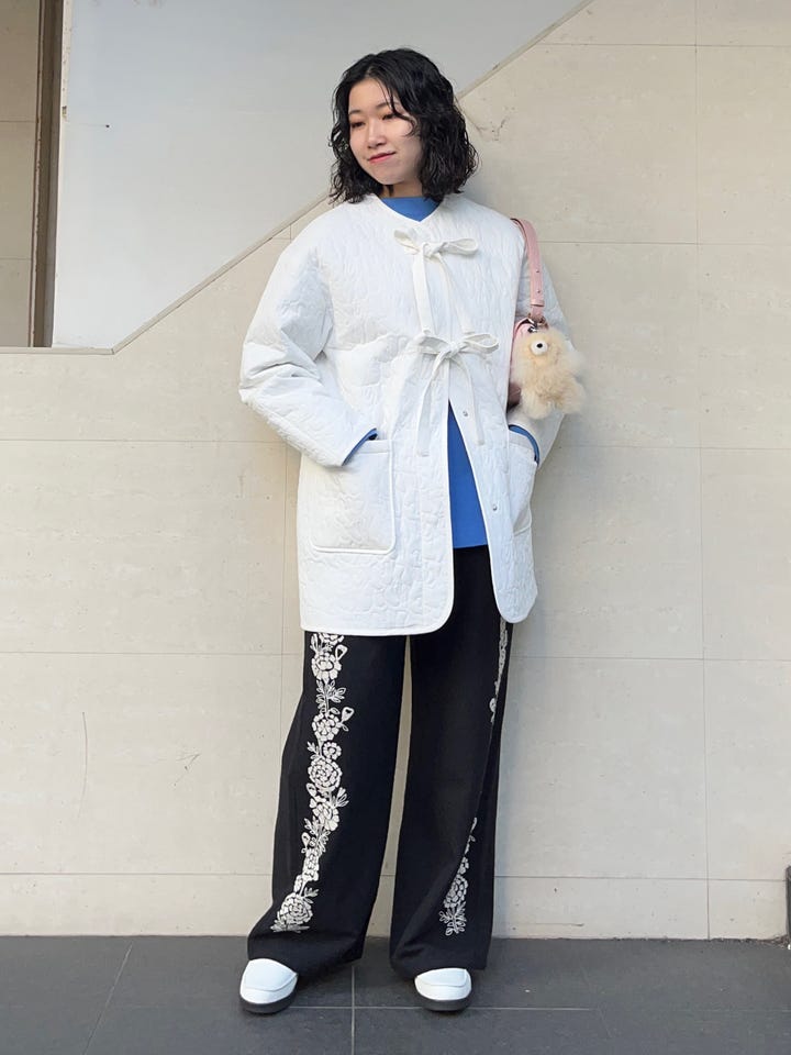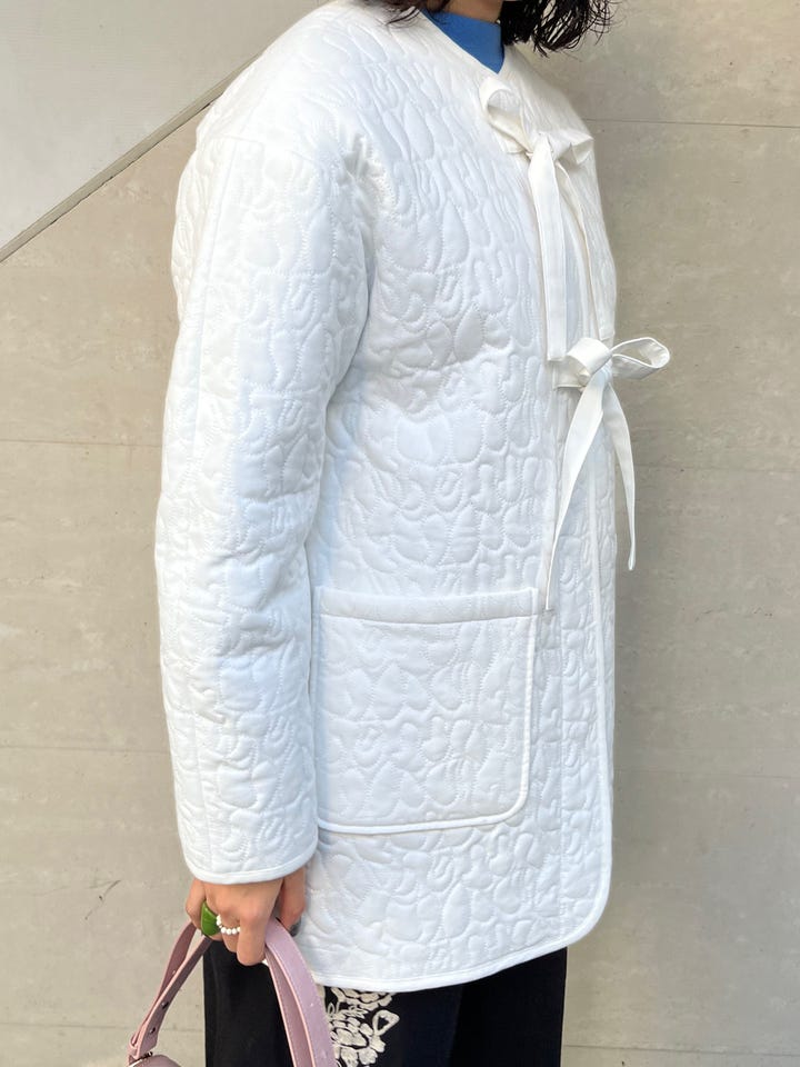 中綿なので暖かく、着丈も割とあって春にぴったりのコートです。デザインがとても可愛く、キルティングの柄とリボンがポイントです。