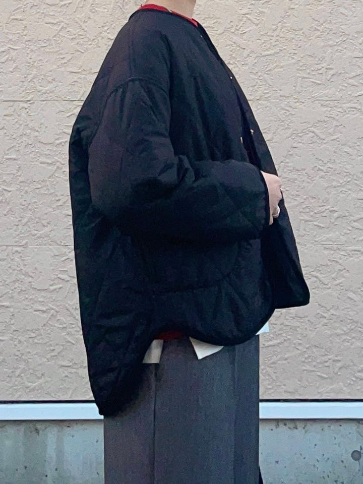 サイズは少しゆったりめで、お尻は隠れるぐらいの丈。リバーシブルで、軽くて暖かい。