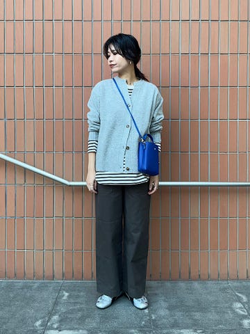 首元のボタンを少し開けると抜け感が出てバランスよく着られます。