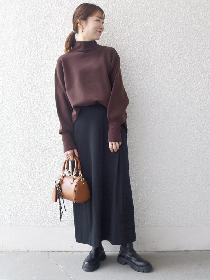 着用アイテム:ハイネック ボリューム スリーブ ロングリブ ニット プルオーバー ブラウン