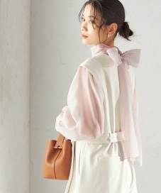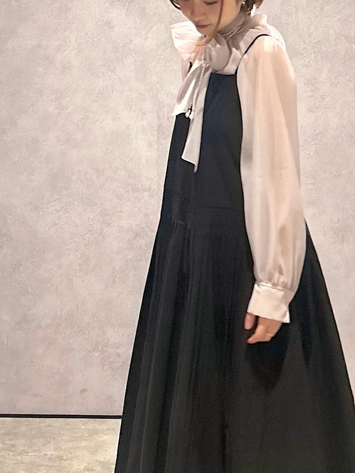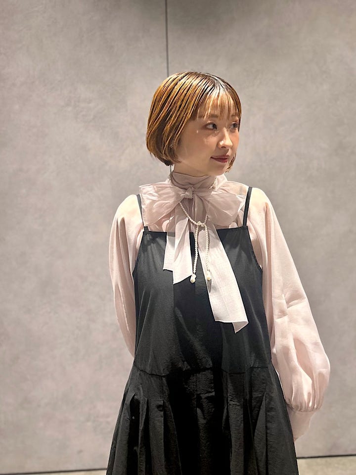 素材感・着心地:ほどよくハリのある素材ですが薄いので今の季節はジャケットやニットのレイヤードにぴったりです。軽くエアリーな素材感のブラウスはコーディネートに甘さをプラスしてくれます。