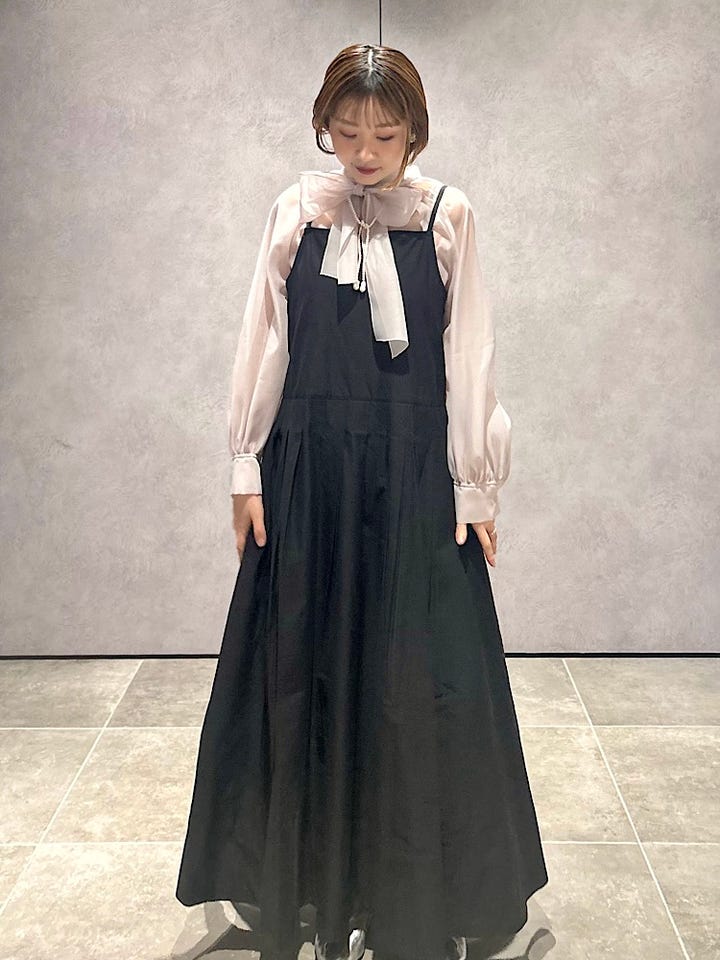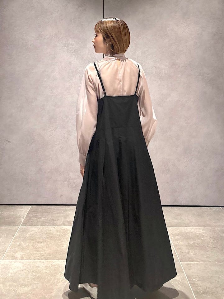 素材感・着心地:トップス部分は比較的ぴったりとしていますが、スカート部分はふわっと広がりめりはりのあるスタイルに。長さもたっぷりあるので足元はバレエシューズなどぺたんこ靴でも、あえてカジュアルにスニーカーでも◎