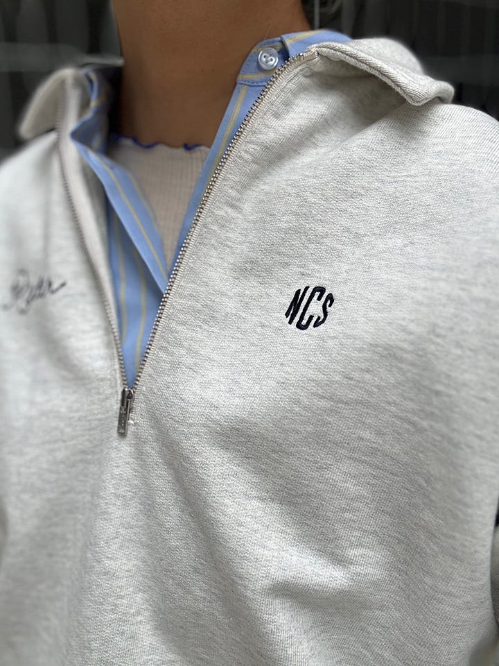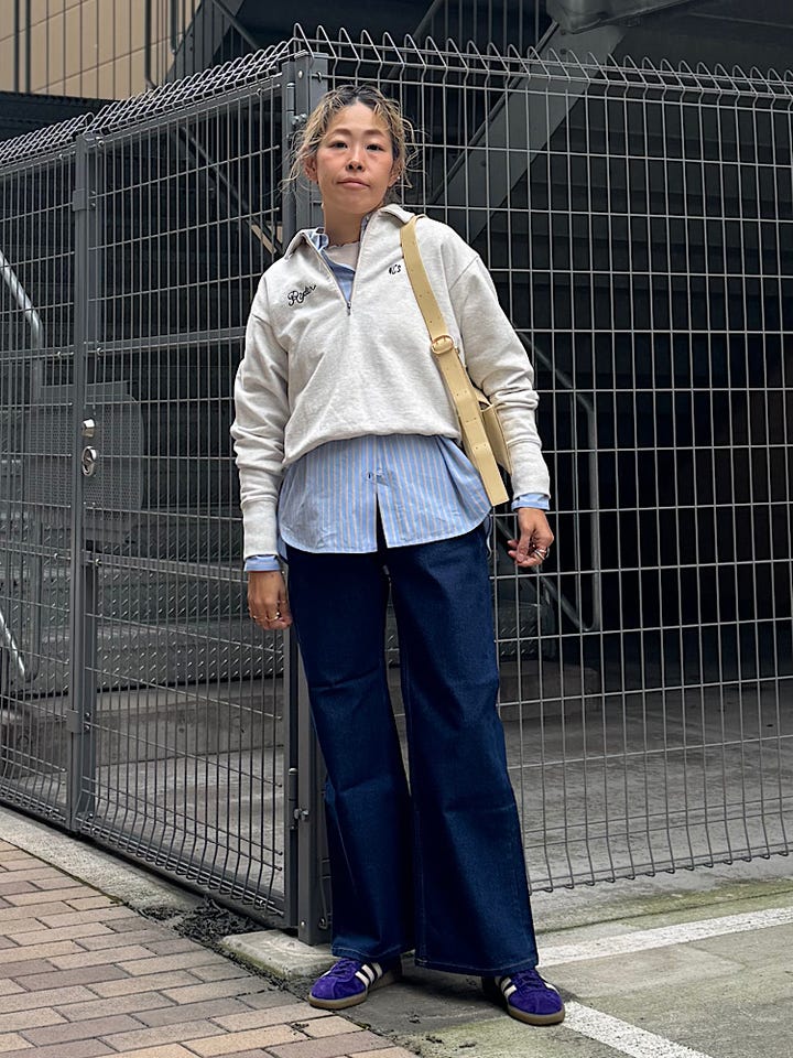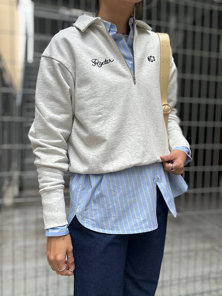 【素材感・着心地】ハーフジップのワンポイントスウェット。カラーシャツをインナーにレイヤード。
