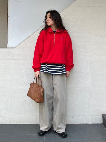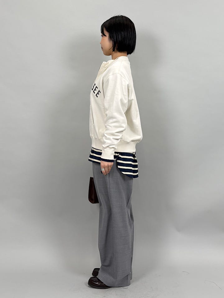 程よい薄さのやわらかいコットン素材。サイズ感はゆったりですが、程よい薄さなのでスウェットやニットのインナーにも使っていただけます◎