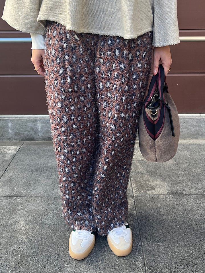 素材感・着心地: ヒョウ柄が印象的なパンツですが、落ち着いた配色なのでスニーカー合わせでカジュアルにも着ていただけます。165センチの身長でも、しっかりとした丈感です。