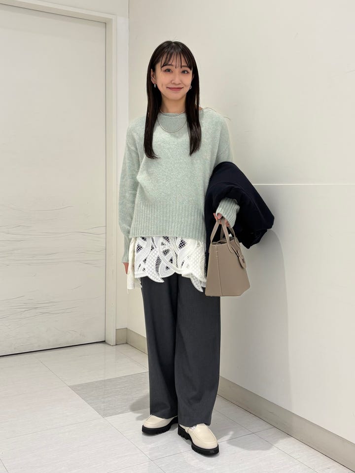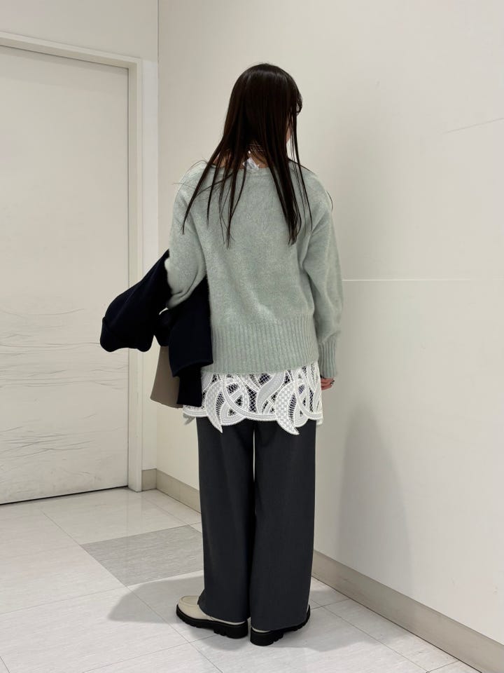 レース素材で女性らしく、一つ持っていればオールシーズン使えます。裾のレースがランダムな形になっており、可愛らしすぎずにきていただけます◎