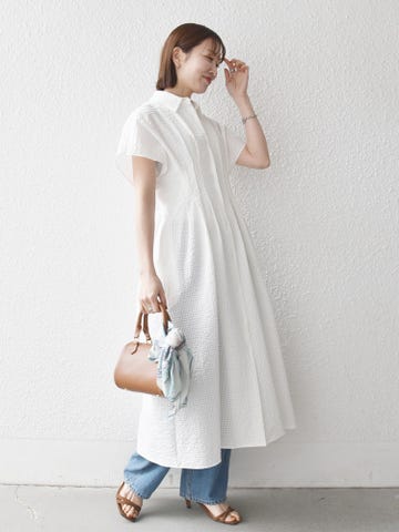 上のボタンだけ留めることで抜け感が出てスタイルアップ効果も◎