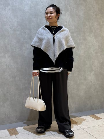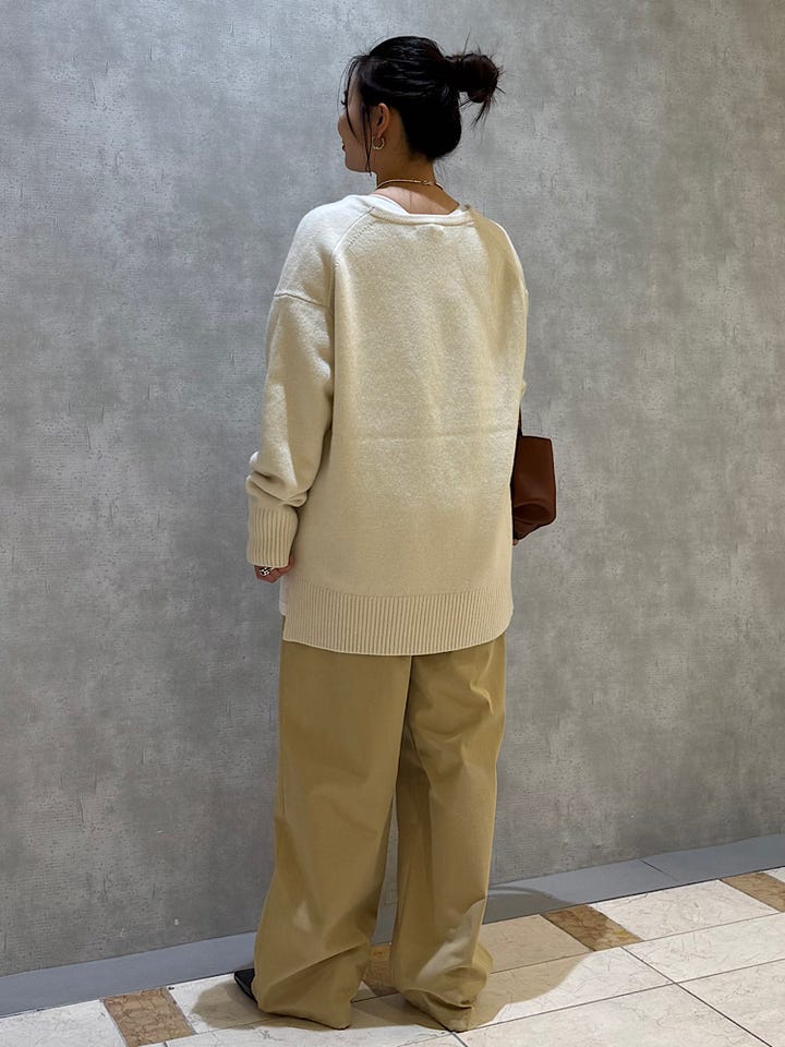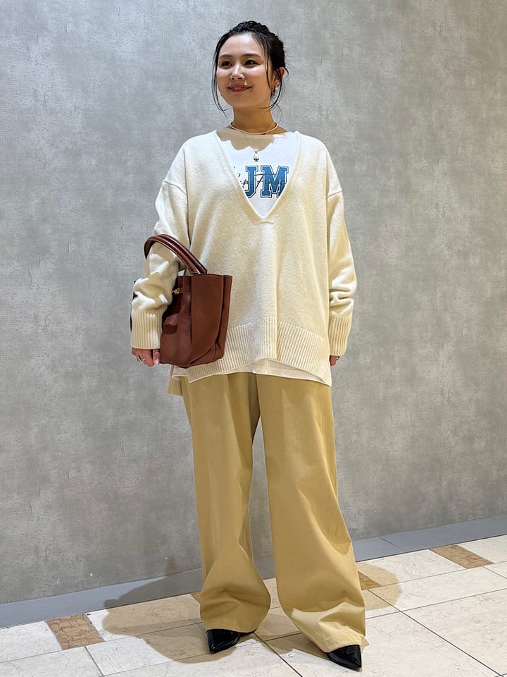 着用感 : 深めのVネックデザインがポイント。サイズ感がオーバーなのでゆったりな着心地がお好きな方におすすめです。ニットの中にはタンクトップを合わせていますが、ロゴTEEやブラウスを合わせても可愛いです^ ^