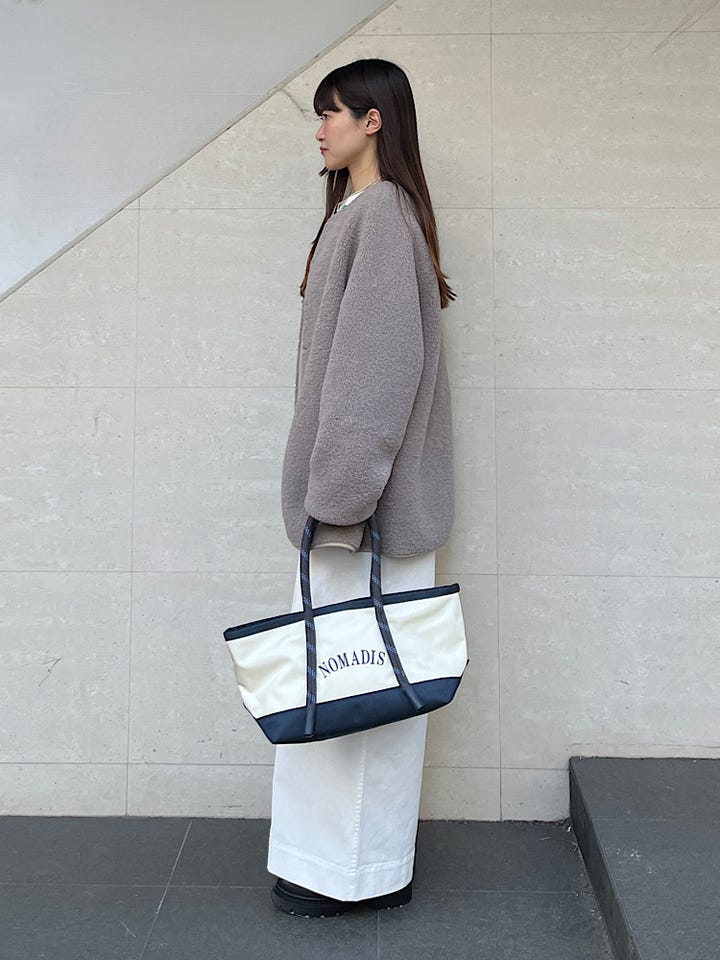 全体的にボリュームの出るシルエットです。着丈も長めですが、肩紐で調節ができます。通年通して着用できる素材です。