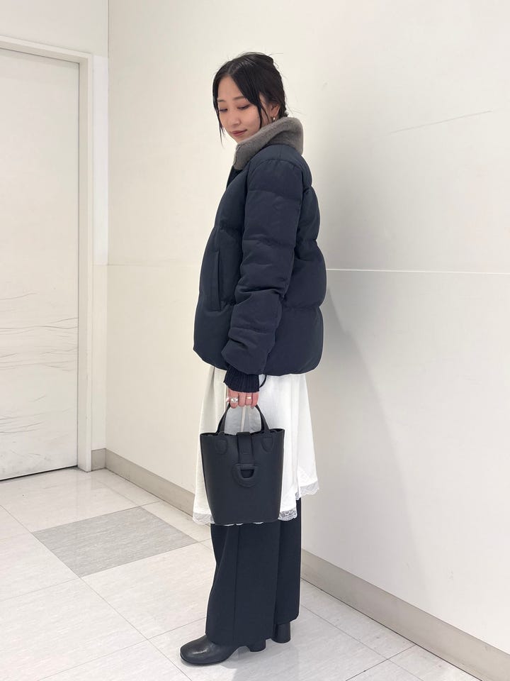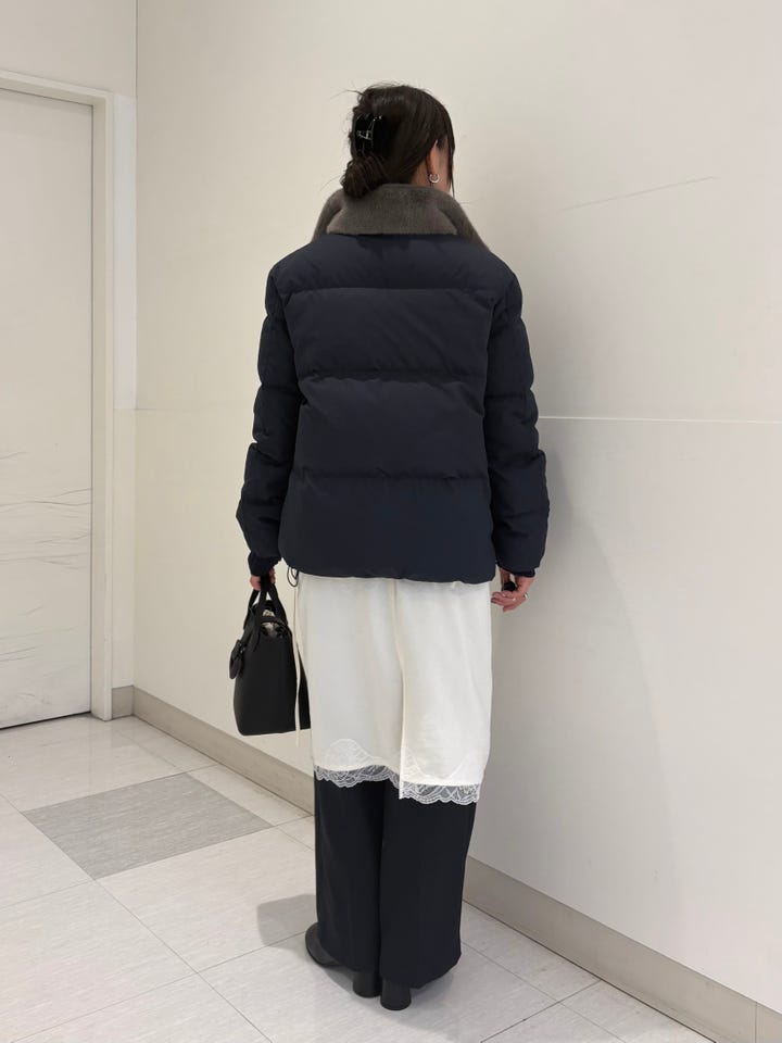 ややゆとりのある着用感です。カジュアルになりがちなダウンジャケットですが、襟元のファーで綺麗めな印象に来ていただけます。裾の絞りを広げると、ややAラインなシルエットになり、すっきり見えします!