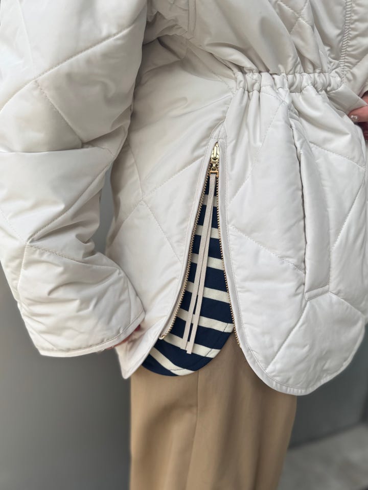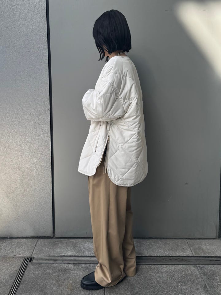 使用感:軽くて気軽に使いやすい。中綿が入ってるため、冬場も使えるしインナー次第で春も使えるおすすめアイテム。