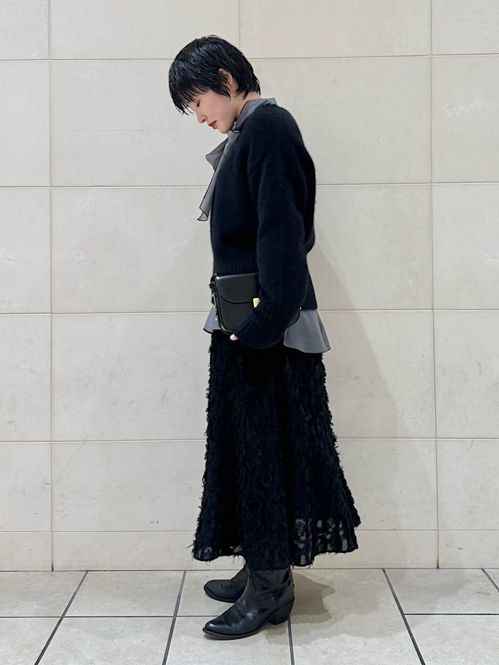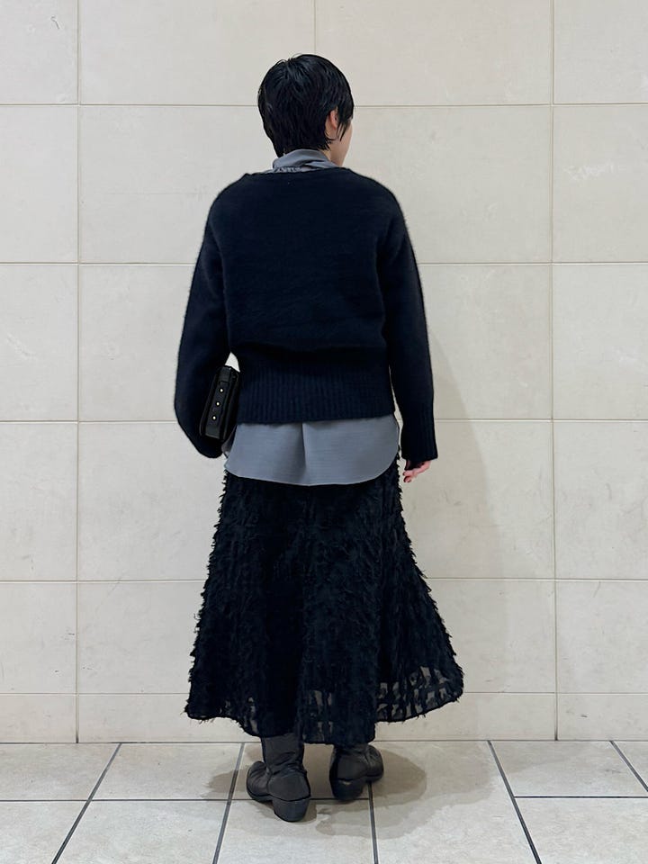 スカートでもパンツでもどちらでも合わせやすいデザインです。
