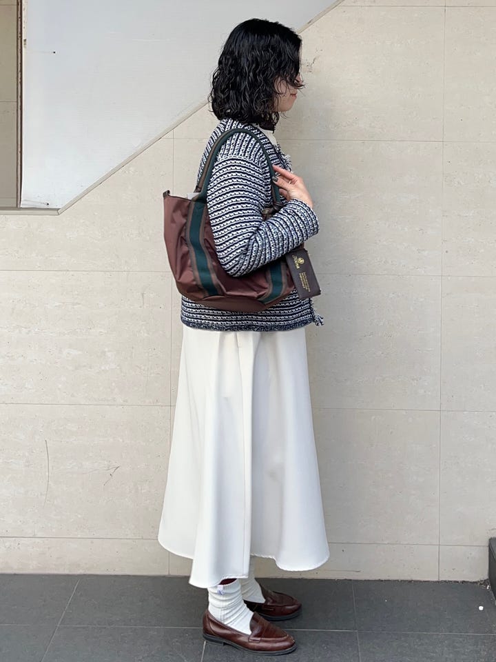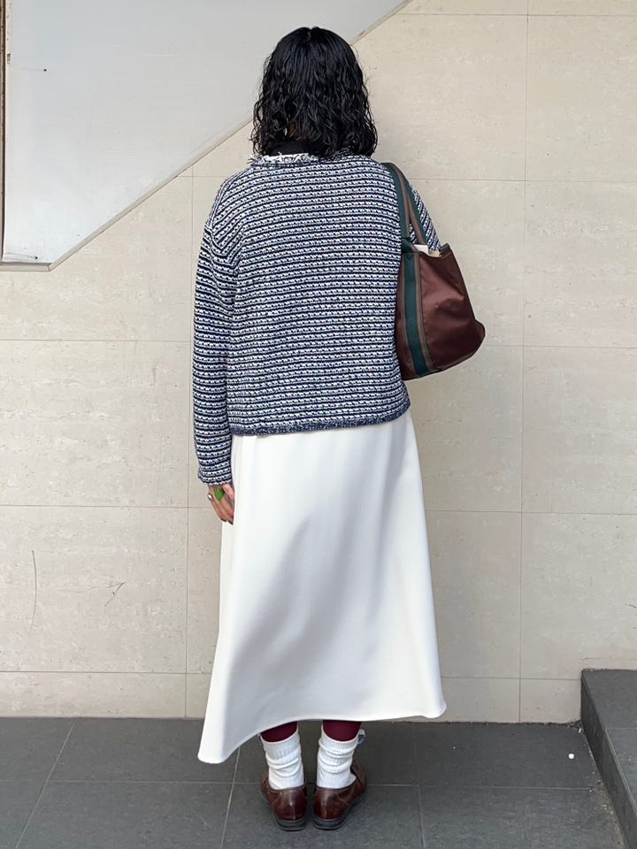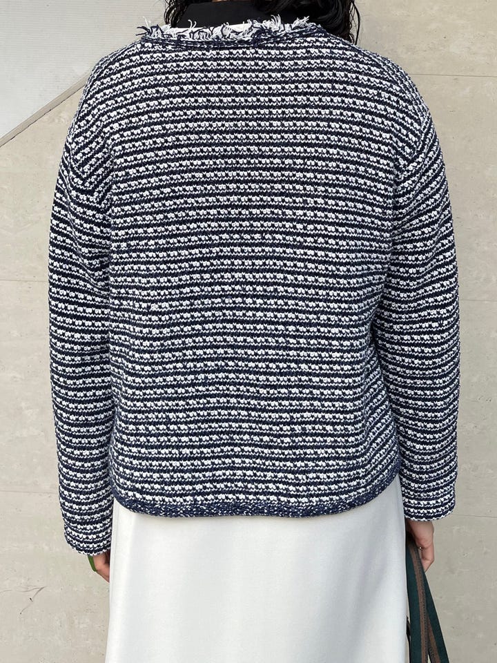 ツイードぽく見えますが、とても柔らかい生地のカーディガン寄りのジャケットです。デニムやチノパンで着崩してもいいですし、セレモニーやお仕事でも◎ ご自宅でケアができるのも嬉しいポイントです。