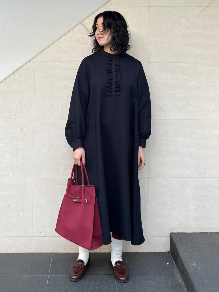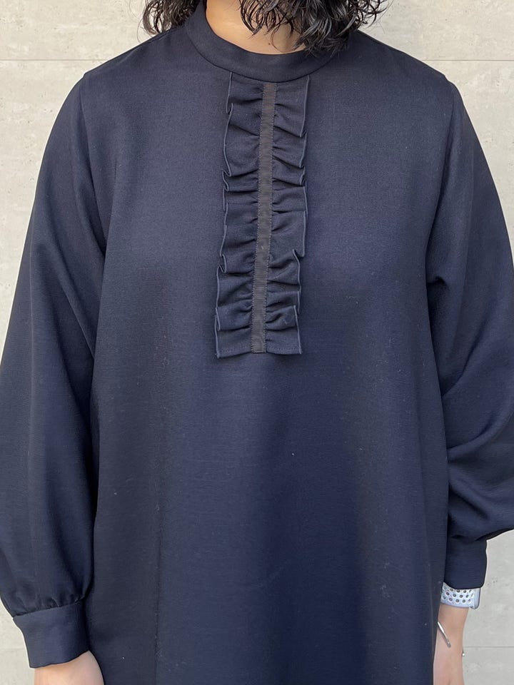ぶかっとした、身体のラインを拾わないデザインでどんな体型の方でも着ていただきやすいです。パフスリーブとフリルで、上半身に少しボリュームがありますが、気にならないサイズ感でした。ポリエステルなのでお手入れも楽です◎