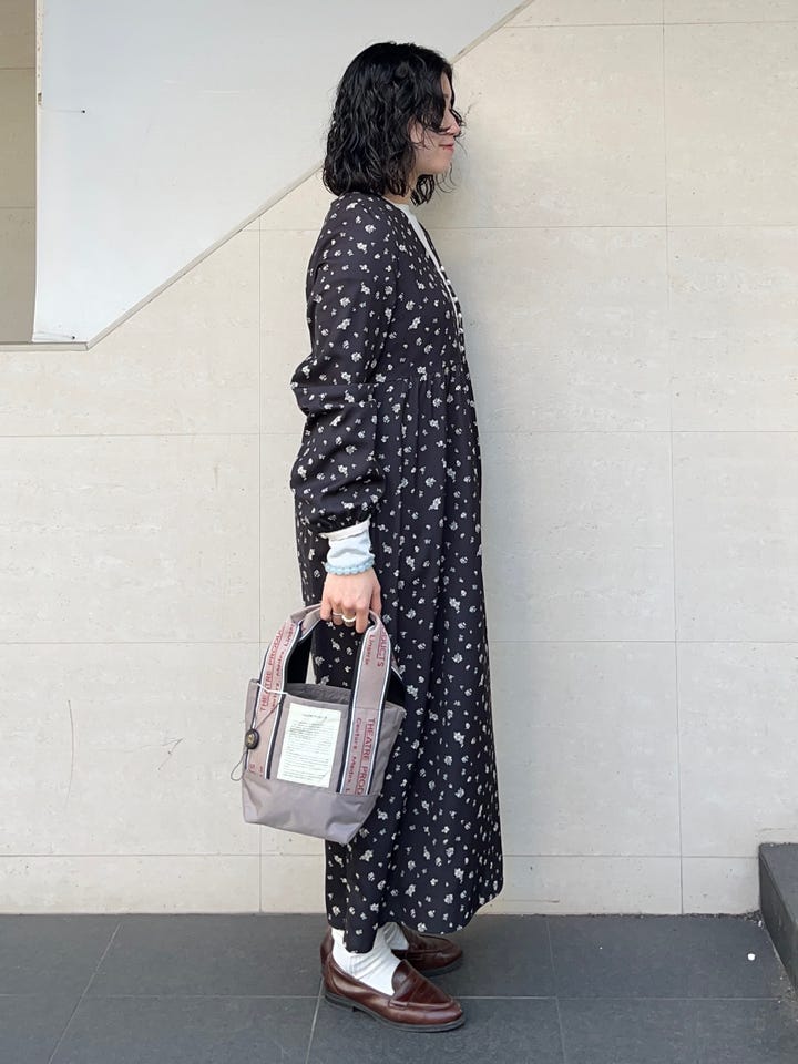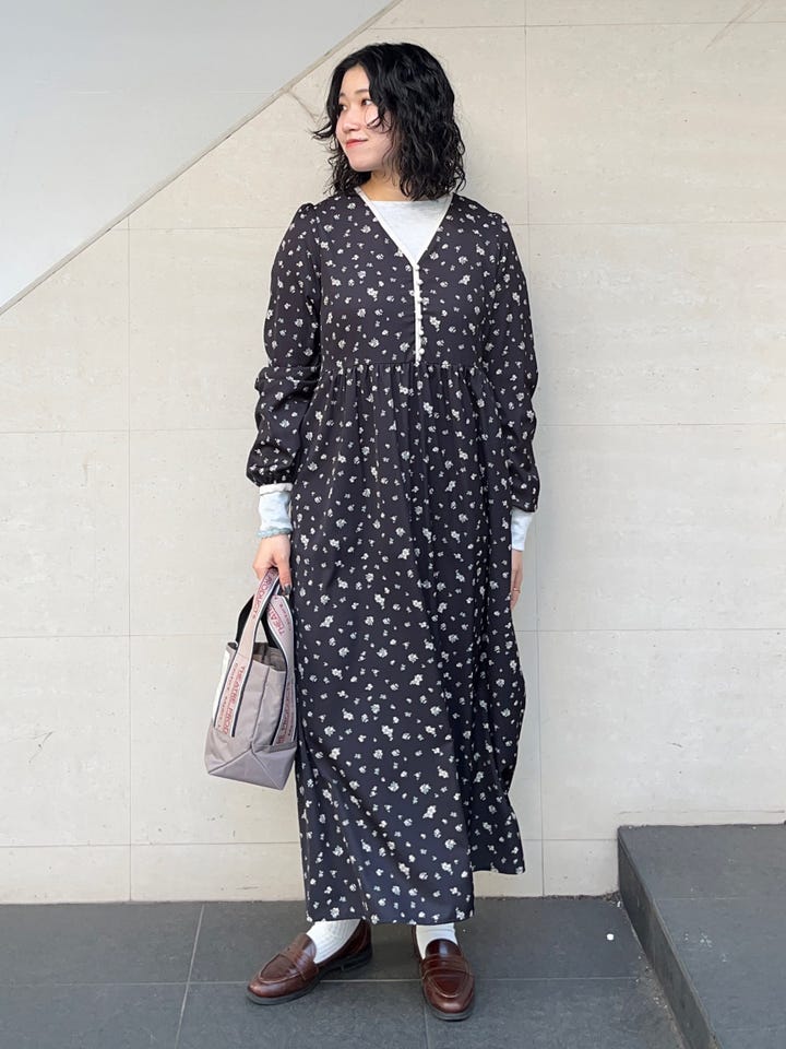 ◆ 商品名: フラワープリントバイカラーVネックギャザーワンピース