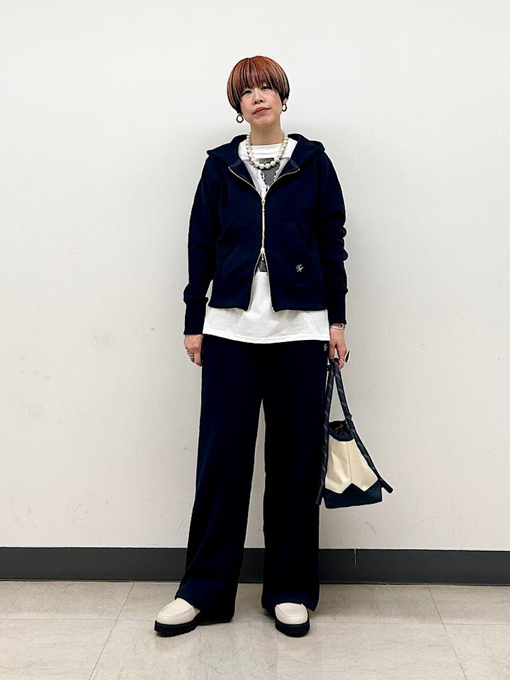 着心地:パーカと同素材。素肌にも気持ちが良い、柔らかく優しい肌触り。ごわつきもなく、軽いのでリラックスして着られます。