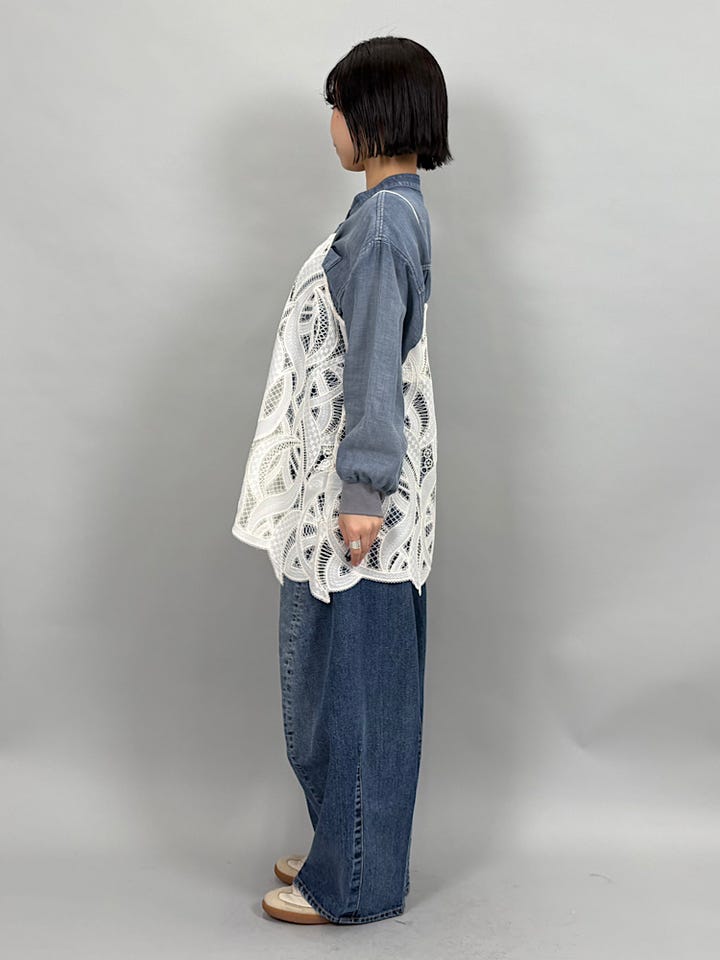 やわらかく丈夫なレース素材。軽い着心地です◎程よい薄さと軽さなので、重ね着でも嵩張らずに着ていただけます◎ 裾のレースはランダムになっているので、上からニットやカーディガンを重ねて裾を出して着るのもかわいいです。