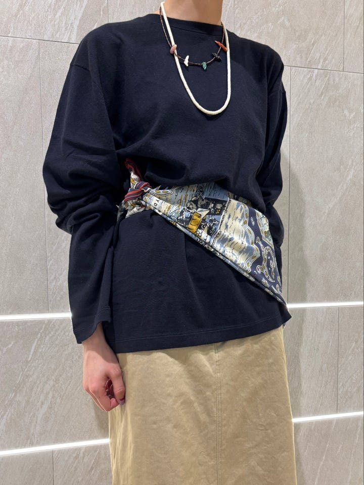 素材感・着心地:コットンカシミヤ素材。すごく滑らかで肌触りがとても良いです。オーバーサイズで、ゆるっとしたシルエットです。スカーフでウエストマークしてゆるっとしすぎないようにしました。