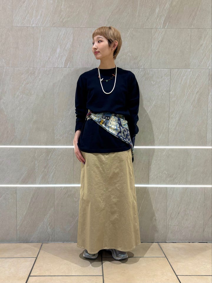 素材感・着心地:ハリのあるチノ素材。身体のラインを拾わず、Aラインのシルエットが出てくれます。
