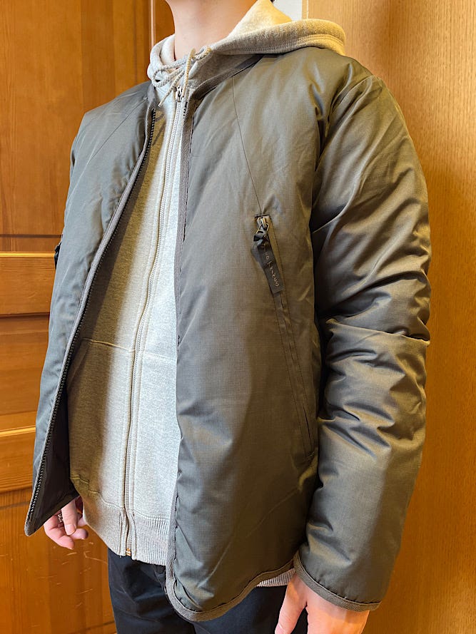 【素材感・着心地】ワイルドシングスとTAIONのコラボダウンカーディガン。インナーダウンとしても使えるサイズ感で、軽い着心地。