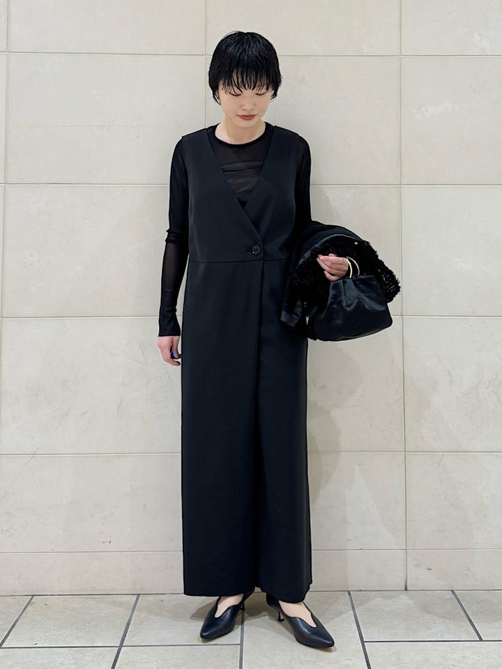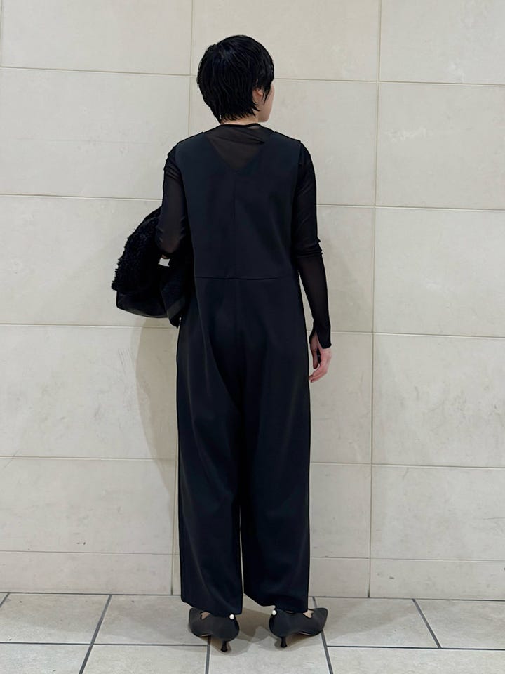 〔36〕little black: 〈洗濯機可能〉ストレッチ ツイル フロント釦 Vネック オールインワン(セレモニー対応可)