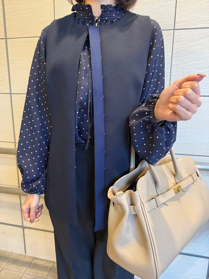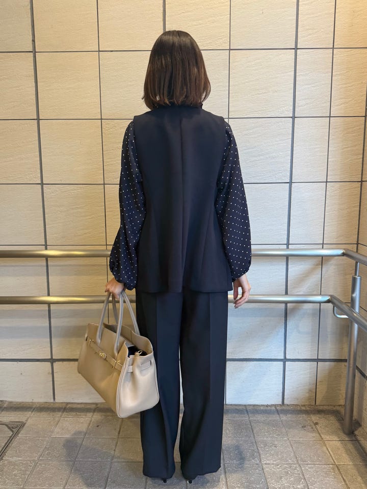 サイズ感・着心地:ダンボール素材で柔らかく着心地良いジレです。前のボタンを閉めてスッキリ着るも良し、開けてブラウスを見せて着るも良し!ジレはひとつあると万能なアイテムですね。