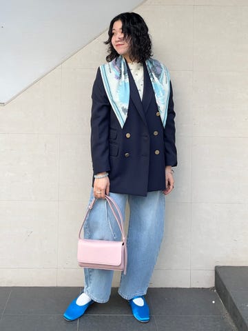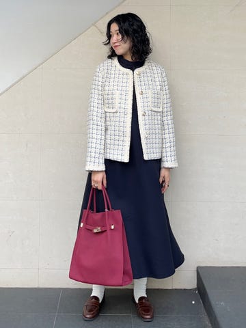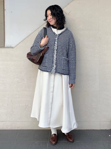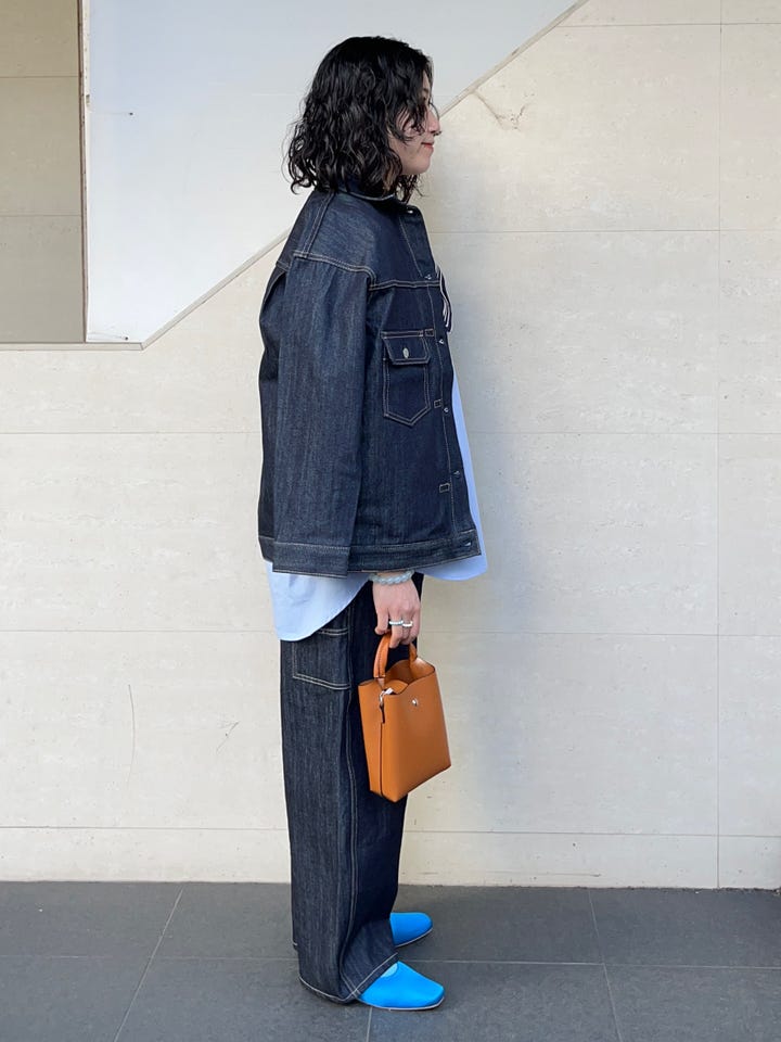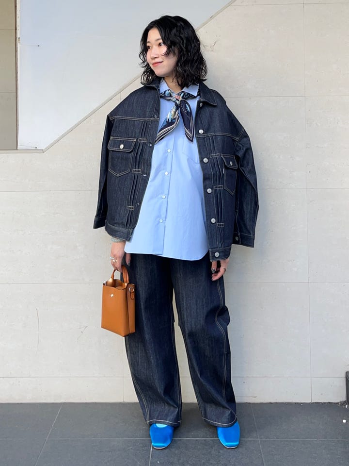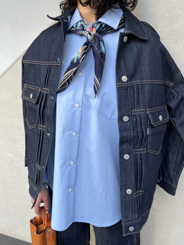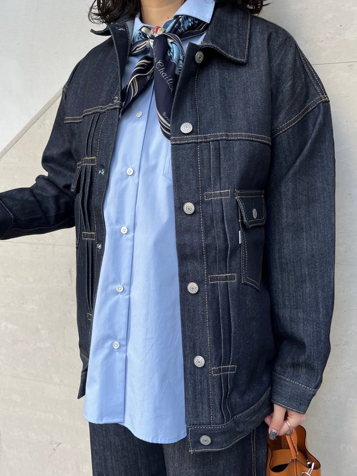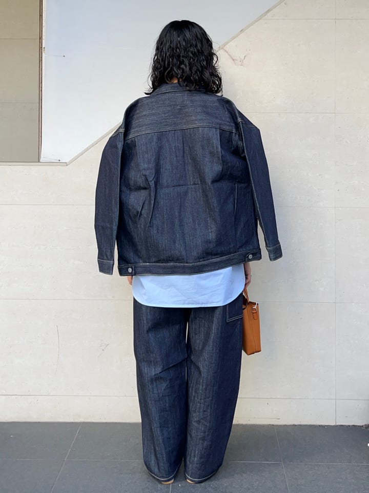割とゆったりしたサイズ感で、身幅も着丈も大きめです。同色のデニムパンツ(2タイプ)と合わせていただけますし、もちろん単品で着るときもワンピースやスカート、パンツ等バランスが取りやすいです◎