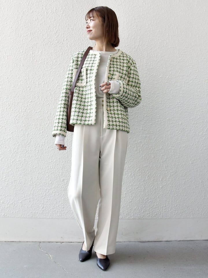 着用アイテム:ツイード パイピング ノーカラー ジャケット グリーン